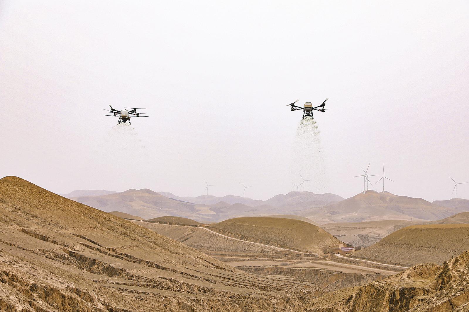 甜水鎮(zhèn)魯掌村利用無人機播撒草籽。 慶陽融媒記者 喬潔 攝