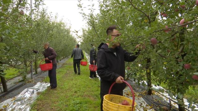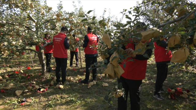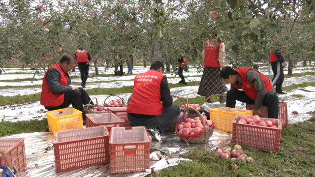 “連陰雨下了好幾天,我們無法收果子,今天天晴了,鄉(xiāng)政府組織干部來幫我們采摘蘋果,給我們幫了大忙了?!?村民呂建榮說。
