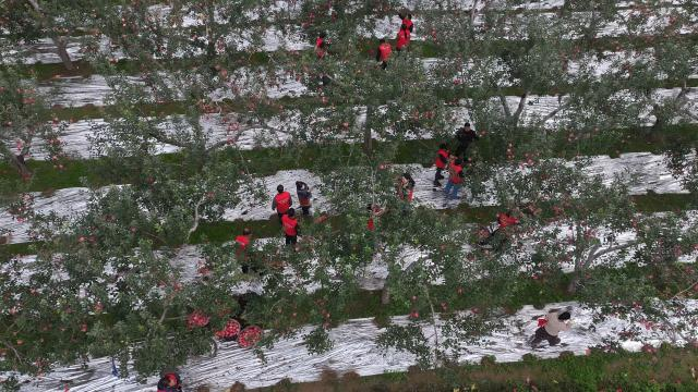 “我們村今年蘋果種植面積達(dá) 700 畝,這兩天組織隊(duì)伍搶收后,已完成全村蘋果總面積的60%。” 黃寨子村村委會(huì)副主任周天峰說。