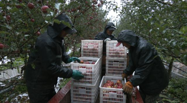 與梅家寨子村的果園一樣,肖咀村的合水潤源有機林果農(nóng)民專業(yè)合作社里也是一片繁忙。近百名工人分散在各個地塊,有的采摘,有的分揀,有的運輸,大家分工明確、配合默契,冒雨搶收晚熟富士蘋果。