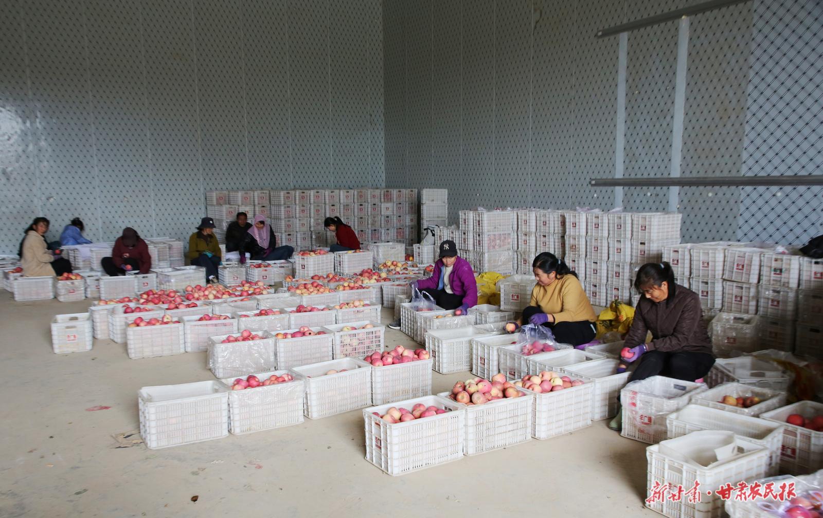 同樣,走進(jìn)寧縣金橋果業(yè)農(nóng)民專業(yè)合作社的包裝場(chǎng)地,香甜的果味撲鼻而來,只見十余名工人分工明確,有的忙著將蘋果按大小、色澤分揀分類,有的則快速稱重打包,有的則將封裝好的蘋果整齊碼放,等待裝車發(fā)售。