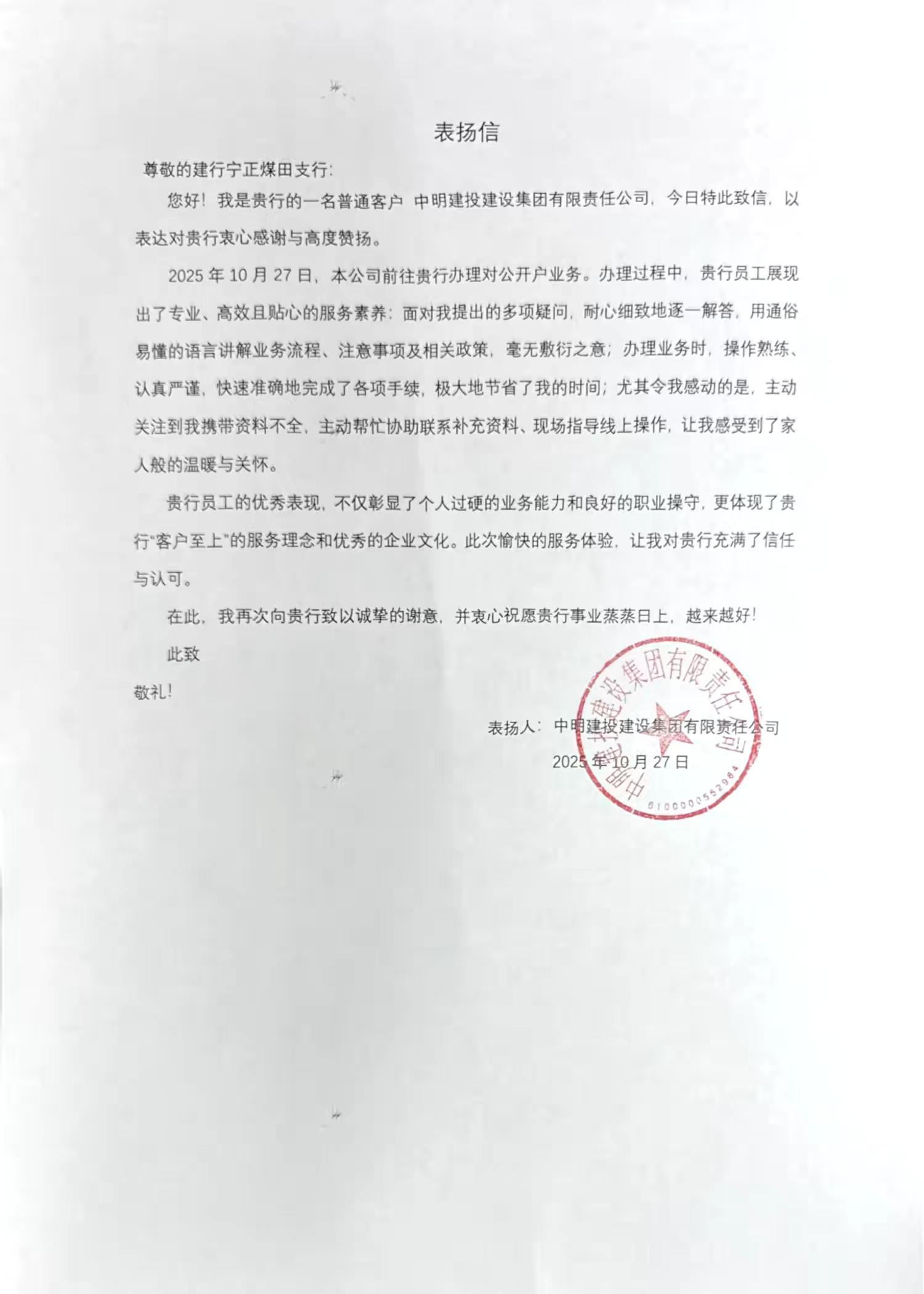 “從咨詢到開戶,沒讓我們多跑一次路,項(xiàng)目能順利開工,真是多虧了你們?。 毙?jiān)陔娫捓镞B連感謝,并在下班時(shí)收到了公司發(fā)來的書面感謝信,字里行間滿是真誠。今后,建行寧正煤田支行還將繼續(xù)聚焦新莊煤業(yè)及周邊企業(yè)的需求,把這份“有溫度的專業(yè)”延伸到更多服務(wù)場(chǎng)景,做企業(yè)合規(guī)發(fā)展路上的“靠譜金融伙伴”。