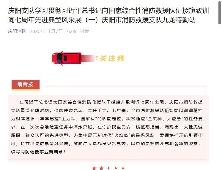 支隊整合資源,構(gòu)建“主流媒體+網(wǎng)絡(luò)新媒體”立體宣傳矩陣。利用兩微一抖等新媒體平臺,策劃推出“慶陽支隊學習貫徹習近平總書記向國家綜合性消防救援隊伍授旗致訓詞七周年先進典型風采展”系列主題報道、“我們這七年”集體成果展,利用圖文、短視頻深度宣傳典型故事,展現(xiàn)隊伍建設(shè)成果,樹立英勇無畏、竭誠為民的良好形象。