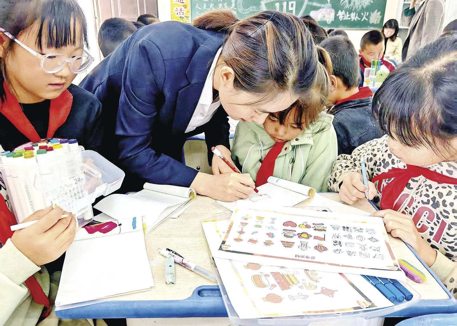 慶陽六中老師教懷安小學(xué)學(xué)生畫畫。