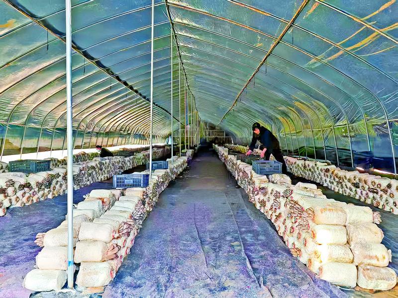 米橋鎮(zhèn)健禾源食用菌基地的工人在采摘平菇。
