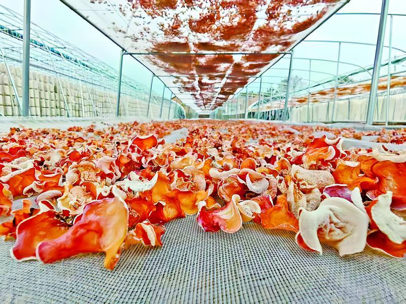 平子鎮(zhèn)食用菌產(chǎn)業(yè)基地正在晾曬的多彩木耳。