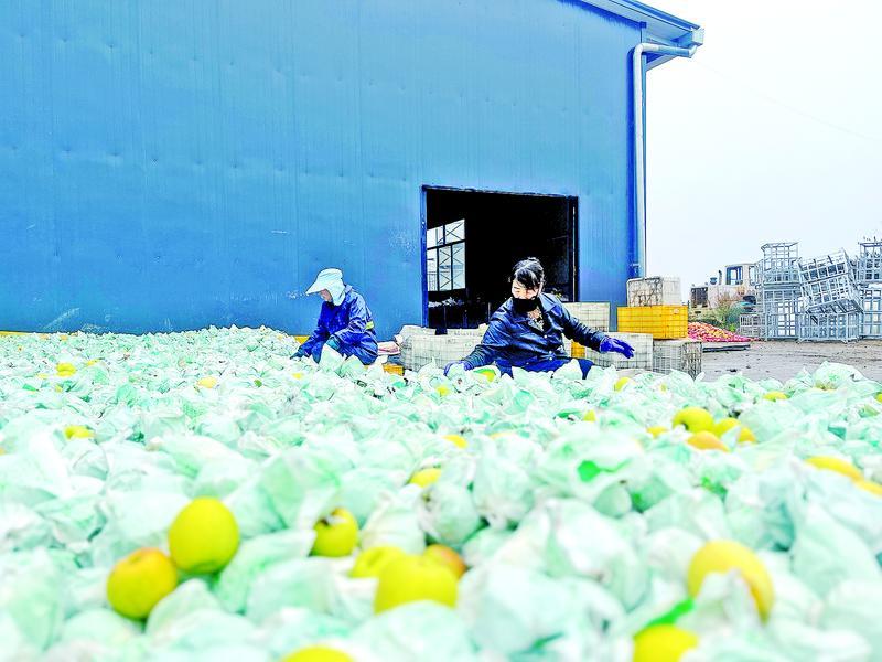鐵樓村三面環(huán)溝,光照充足,晝夜溫差大。憑借得天獨厚的自然條件,這里產(chǎn)出的蘋果以果形大、色澤亮、口感脆甜、汁多味美而聞名。此次豐收的“瑞雪”蘋果,屬晚熟黃綠色短枝型,具有果面光潔、皮薄多汁、果香濃郁且極耐儲存的特點,一經(jīng)成熟便吸引了眾多客商線上線下爭相訂購。