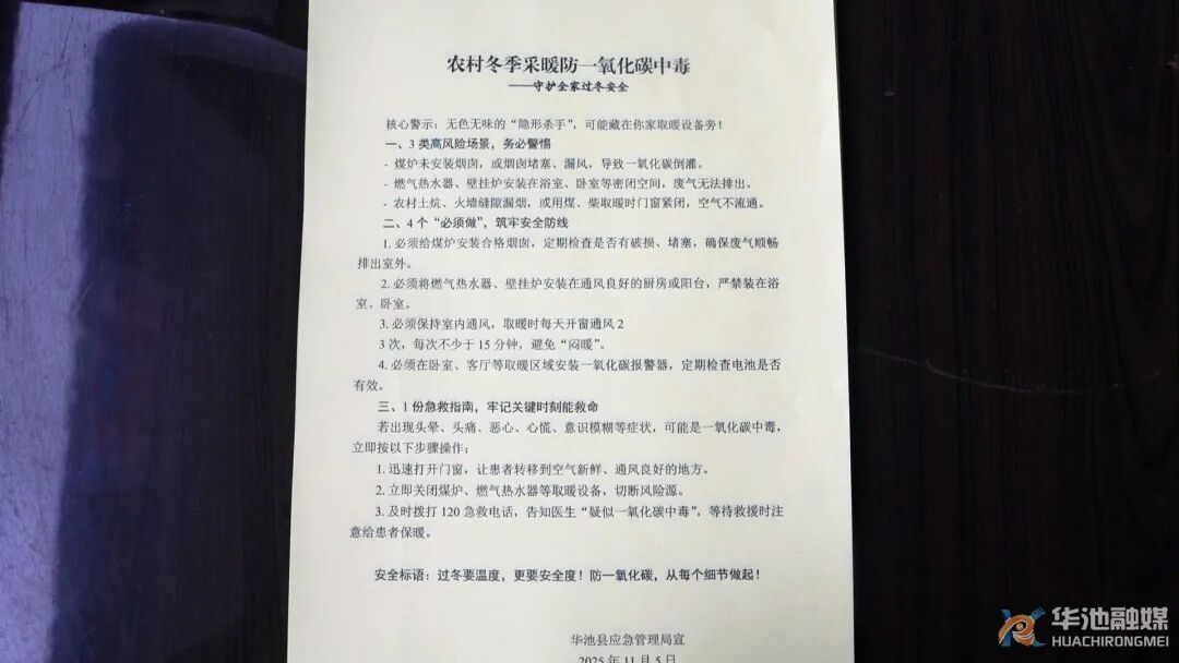隨著冬季氣溫持續(xù)走低,群眾取暖進入高峰期,一氧化碳中毒等安全隱患隨之增加。華池縣將群眾冬季取暖安全擺在突出位置,提前謀劃、精準施策,通過聯(lián)防聯(lián)控、隱患排查、物資保障等舉措,織密冬季取暖“安全網(wǎng)”,全力守護群眾溫暖安全過冬。