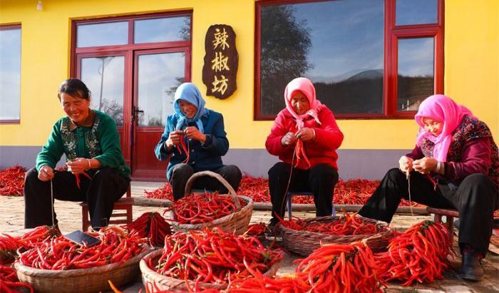 “辣嬸子”陳歲香和村民一起串辣子。 喬潔攝