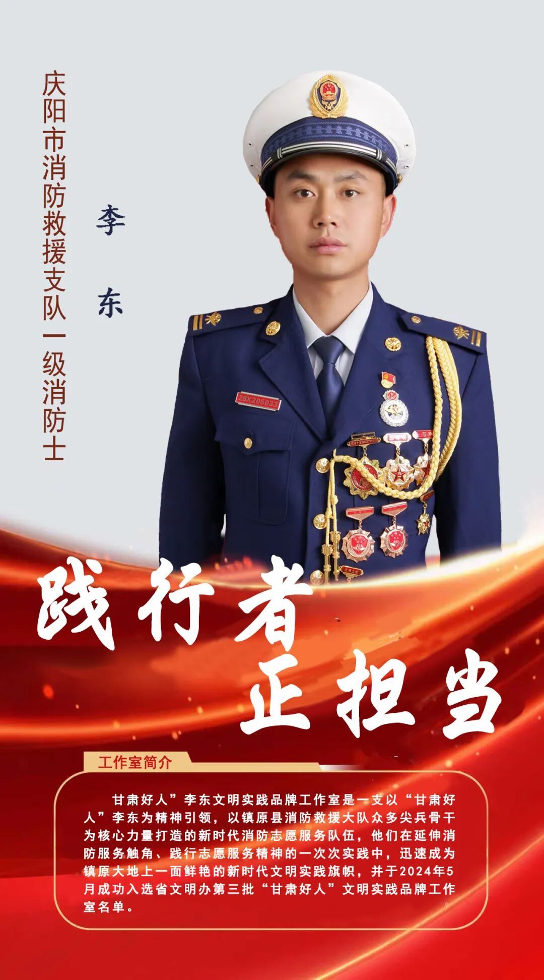 “甘肅好人”李東文明實踐品牌工作室成立于2023年10月,這支以“甘肅好人”李東為引領,由鎮(zhèn)原縣消防救援大隊尖兵骨干為核心組建的新時代消防志愿工作室伍,從誕生之日起,就始終錨定“政治堅定、作風過硬、服務為民”建設目標,以消防救援隊伍“對黨忠誠、紀律嚴明、赴湯蹈火、竭誠為民”訓詞精神為根本遵循。于2024年5月成功入選省文明辦第三批“甘肅好人”文明實踐品牌工作室名單,多次獲得駐地黨委政府表彰獎勵。
