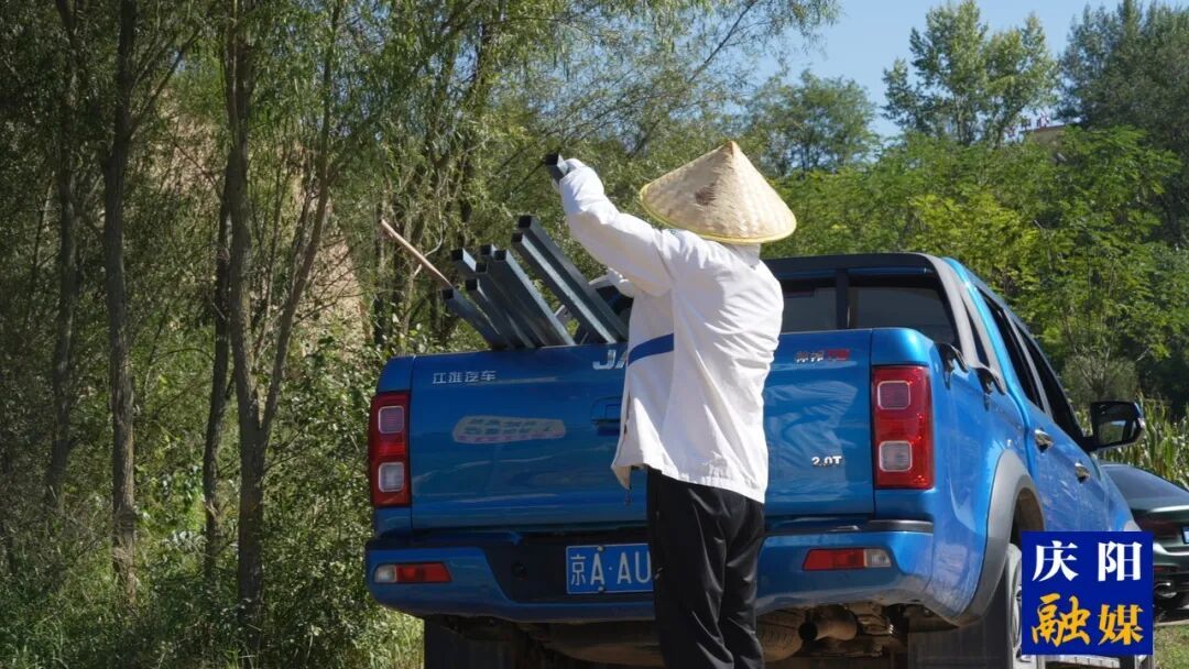 劉德成從車上取下稻種標(biāo)識牌。西峰融媒記者 豆苗 攝