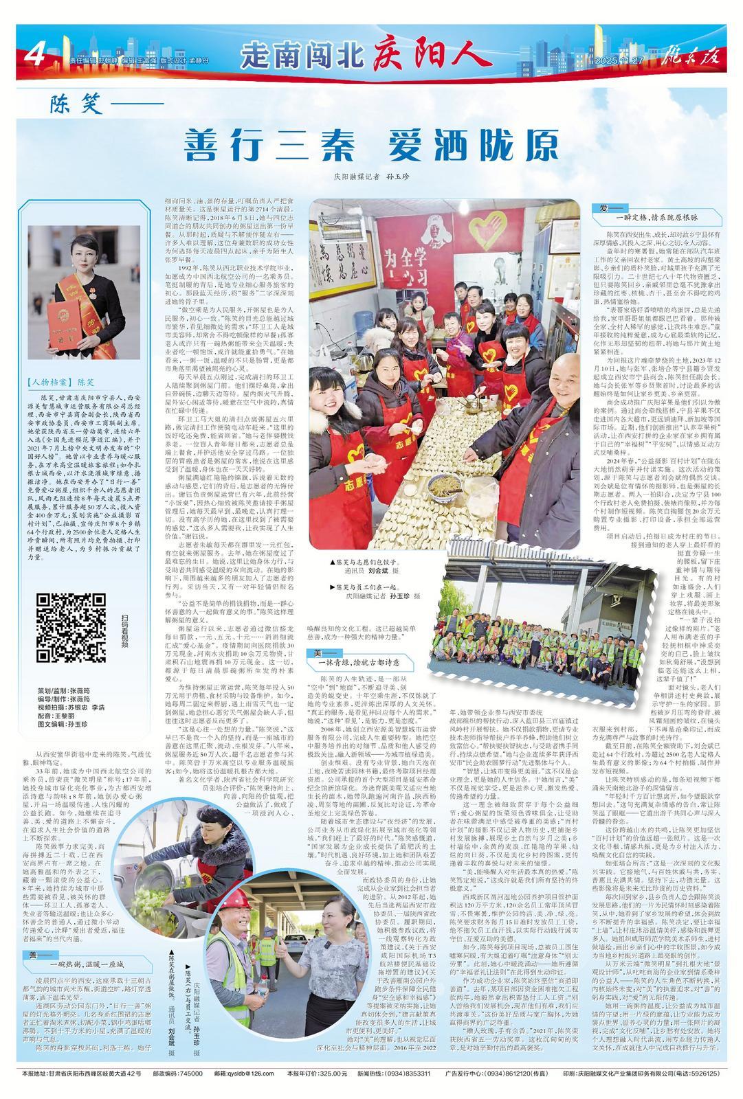 陳笑,甘肅省慶陽市寧縣人,西安源美智慧城市運營服務有限公司總經(jīng)理、西安市寧縣商會副會長,陜西省西安市政協(xié)委員、西安市工商聯(lián)副主席。她榮獲陜西省五一勞動獎章,連續(xù)六年入選《全國先進模范事跡匯編》,并于2021年7月上榜中央文明辦發(fā)布的“中國好人榜”。她曾以專業(yè)素養(yǎng)與暖心服務,在萬米高空溫暖旅客旅程;如今扎根古城西安,以汗水澆灌城市綠意、播撒潔凈。她在西安開辦了“日行一善”免費愛心粥屋,組織千余人的志愿者團隊,風雨無阻連續(xù)8年每天凌晨5點開展服務,累計服務超50萬人次,投入資金400余萬元;策劃實施“公益攝影 百村計劃”,已拍攝、宣傳慶陽市8個鄉(xiāng)鎮(zhèn)64個行政村,為2500余位老人定格人生珍貴瞬間,所有照片均免費拍攝、打印并贈送給老人,為鄉(xiāng)村振興貢獻了力量。
