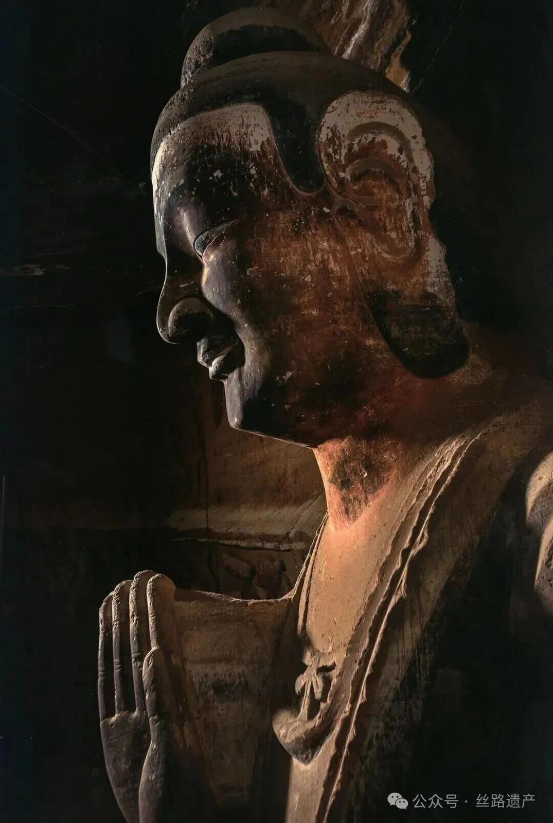 如北魏第165窟的造像受中原文化的影響較大,其佛像豐圓的面龐,壯實(shí)的身軀,厚重的褒衣博帶式袈裟,莊重肅穆的神情等都很接近云岡三期石窟和龍門(mén)石窟賓陽(yáng)中洞的造像,但又融入了獨(dú)特的地域風(fēng)格。第165窟佛與菩薩比例成倍增大,佛高8米,菩薩高4米,非常夸張地反映了佛與菩薩等級(jí)與地位的不同。第165窟的七身立佛,分布在三個(gè)壁面,每個(gè)佛身后鑿舟形淺龕,七佛二彌勒的組合十分對(duì)稱(chēng)。在雕刻技藝上,采取粗獷奔放與生動(dòng)細(xì)膩相結(jié)合的手法,既概括洗練,又嚴(yán)謹(jǐn)不茍,給人以莊嚴(yán)大方和樸實(shí)淳厚之感。七佛嚴(yán)謹(jǐn)對(duì)稱(chēng)的布局,雄偉壯觀,莊重不凡,令人肅然起敬。乘象菩薩和阿修羅天,構(gòu)思新穎,匠心獨(dú)運(yùn)。菩薩安詳?shù)刈谙蟊成希涮耢o優(yōu)美的姿態(tài)與慈祥和藹的微笑,使人頗感可親可敬。菩薩身后的比丘,淳樸而又虔誠(chéng),身前的馭象奴神色嚴(yán)厲。佛的護(hù)法阿修羅天多頭多臂,手持日月,張臂舉杵。古代工匠并沒(méi)有完全按照佛經(jīng)上描述去雕刻,而是僅僅通過(guò)洗練硬直的刀法,概括地顯示出他震撼天地的威力和氣吞山河的氣概。這種充滿(mǎn)想象和夸張的浪漫主義的表現(xiàn)手法,相當(dāng)具有特點(diǎn)。