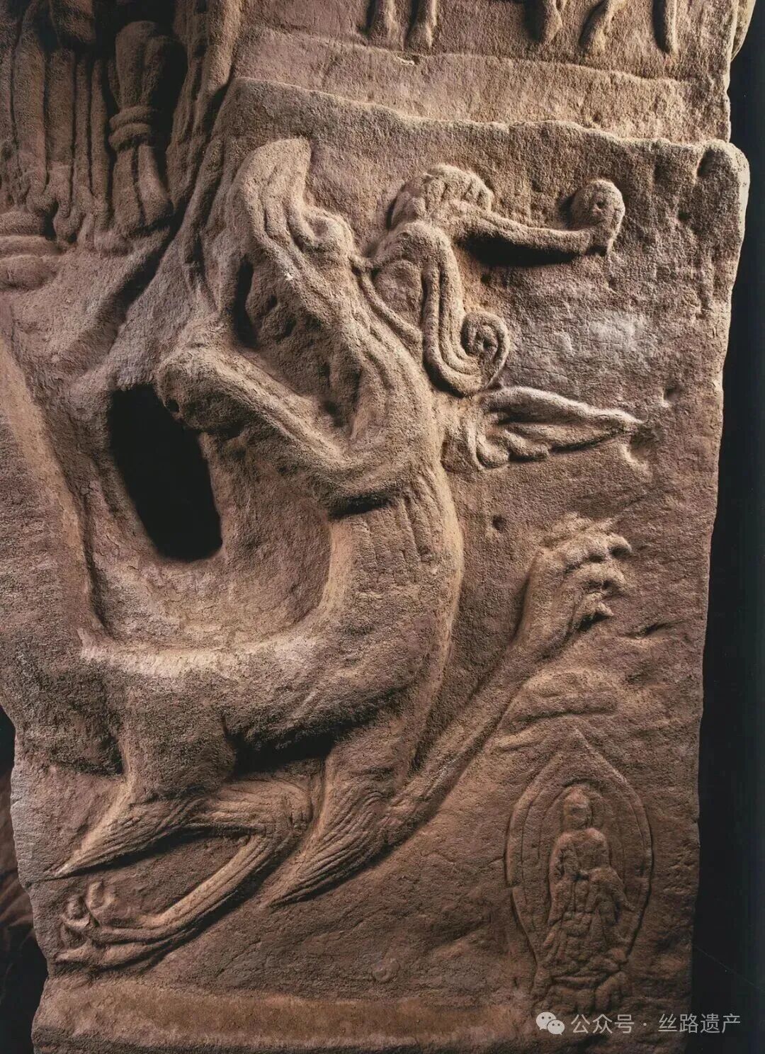 北1號(hào)窟 中心柱東面下層佛龕龕楣回首龍、立佛(北魏)