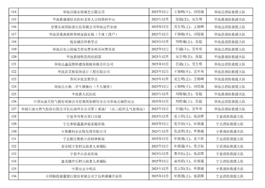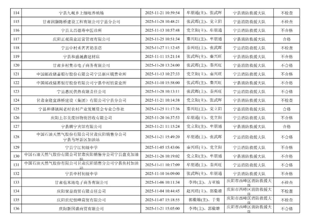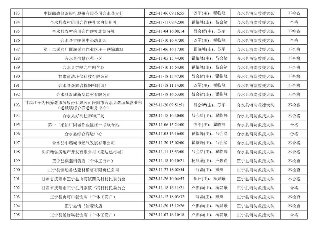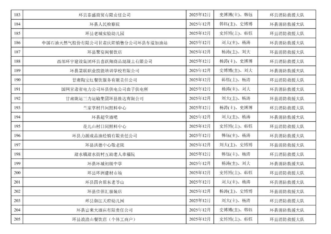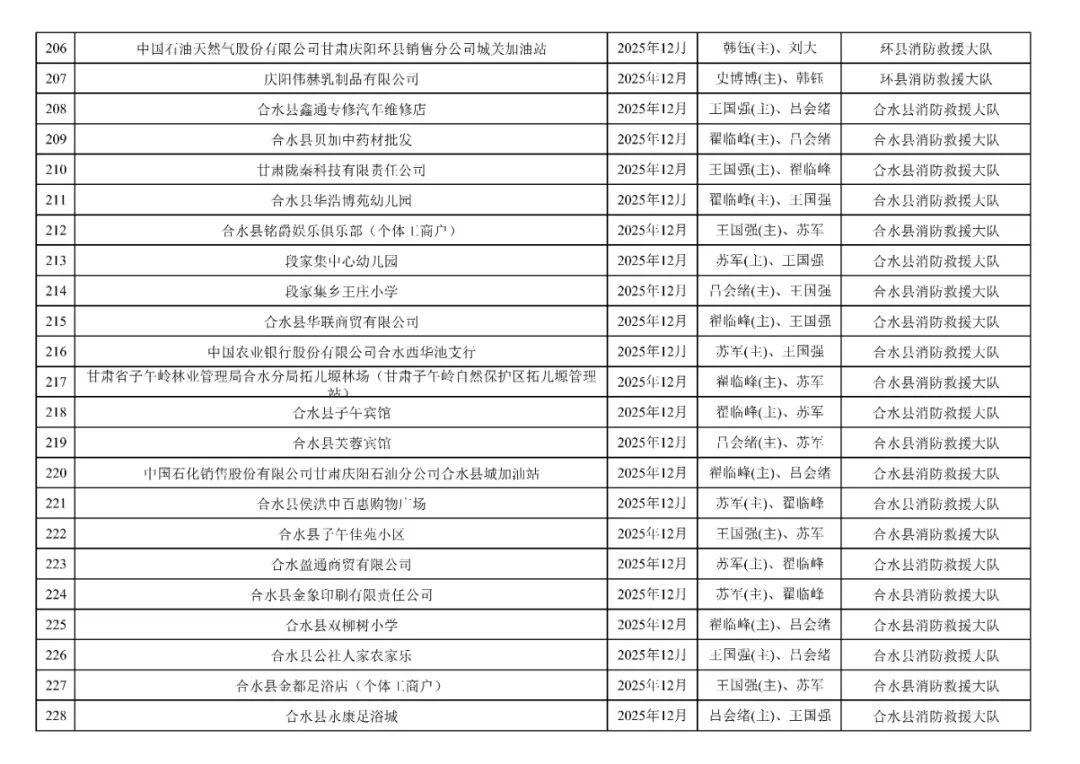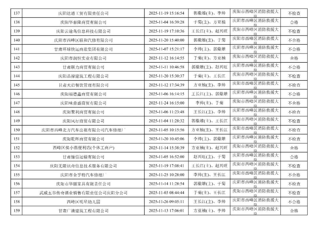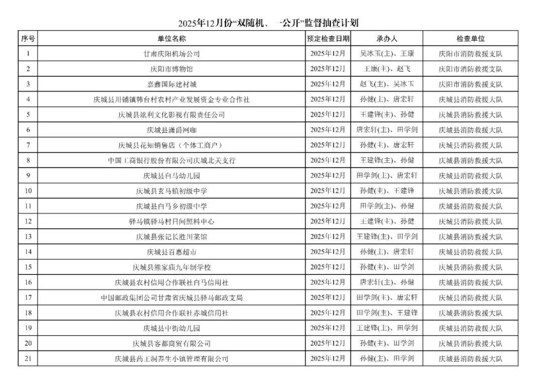 為貫徹落實《消防救援局關于全面推行“雙隨機、一公開”消防監(jiān)管工作的通知》(應急消〔2019〕241號),認真組織實施“雙隨機、一公開”消防監(jiān)管工作,現(xiàn)將2025年11月份“雙隨機、一公開”消防監(jiān)督檢查結果及12月份監(jiān)督抽查計劃公示如下: