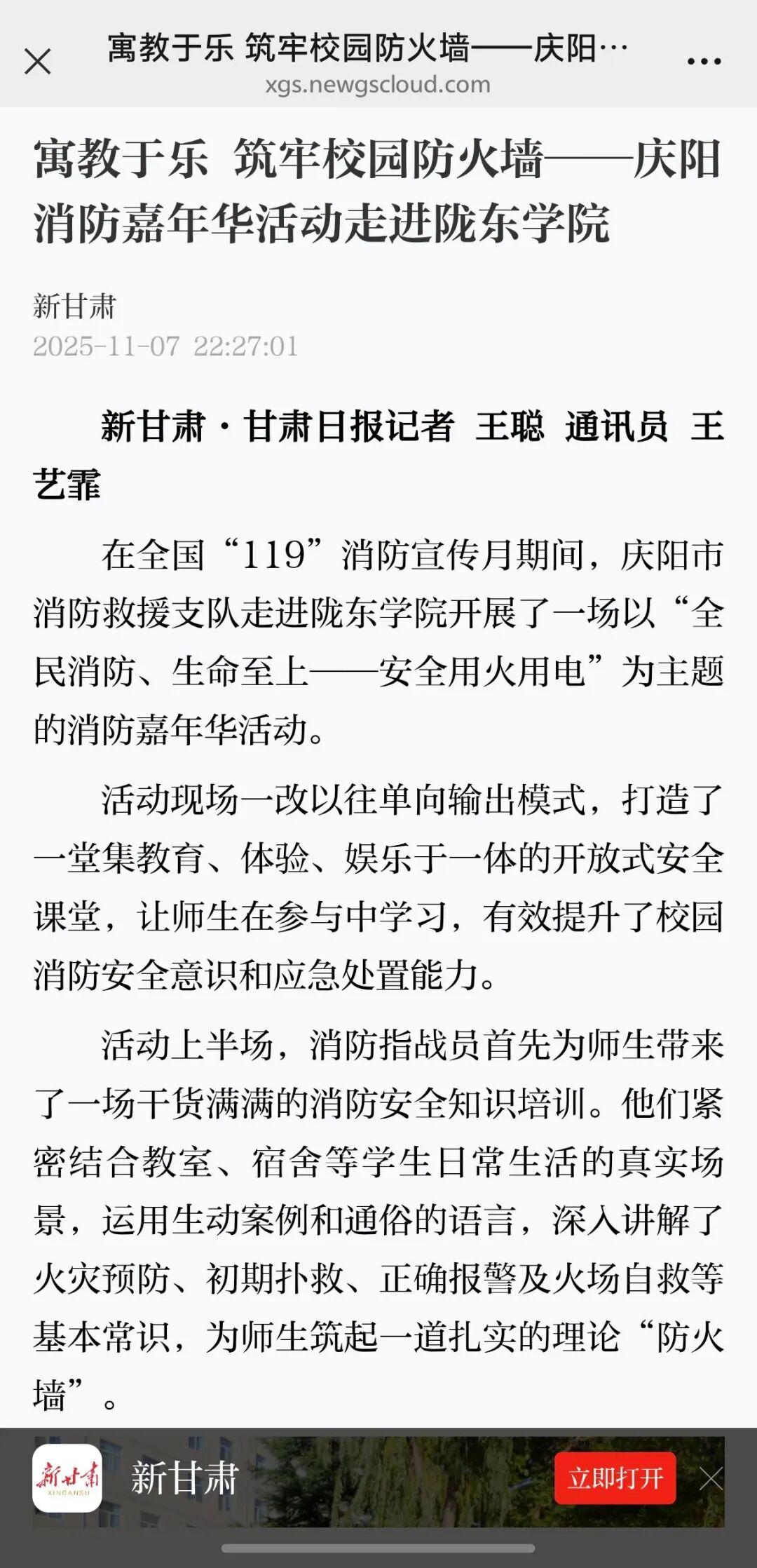 據(jù)了解,中央電視臺(tái)、甘肅電視臺(tái)、甘肅法制報(bào)、慶陽(yáng)融媒體中心等各級(jí)媒體持續(xù)關(guān)注宣傳月動(dòng)態(tài),密集報(bào)道各項(xiàng)特色活動(dòng),讓“全民消防、生命至上”的理念深入人心。其中,11月4日走進(jìn)隴東學(xué)院開(kāi)展的消防嘉年華活動(dòng),以其創(chuàng)新的活動(dòng)形式成為媒體關(guān)注的焦點(diǎn)。