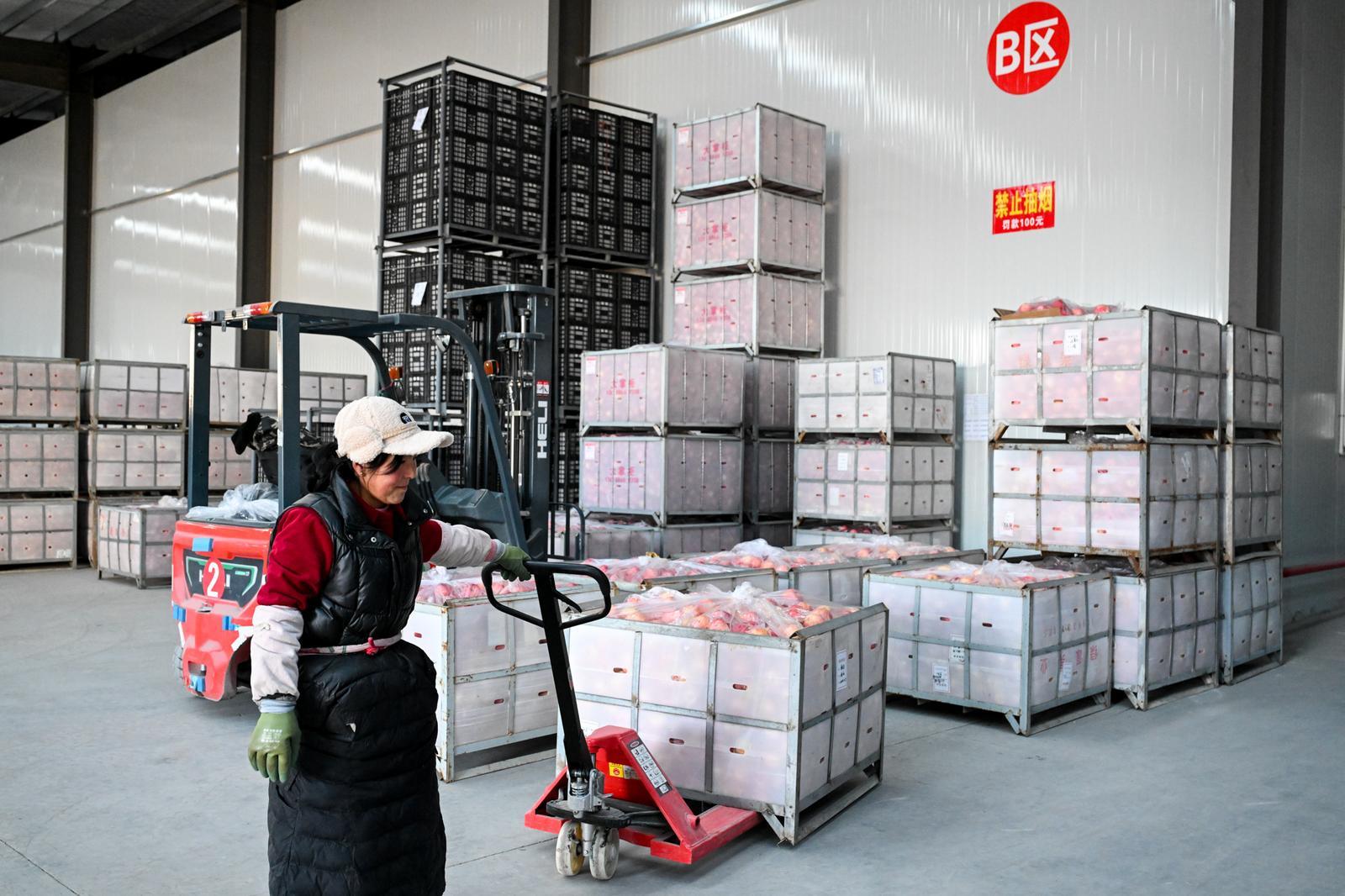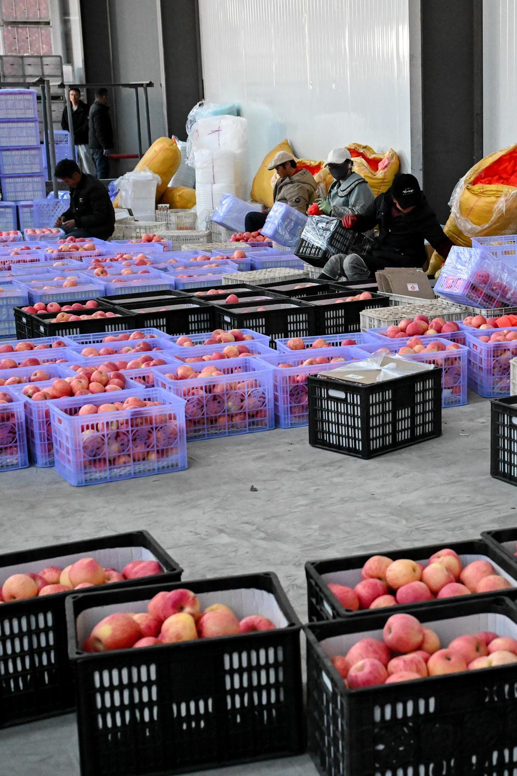 工人將蘋果裝袋搬運(yùn),準(zhǔn)備發(fā)貨。