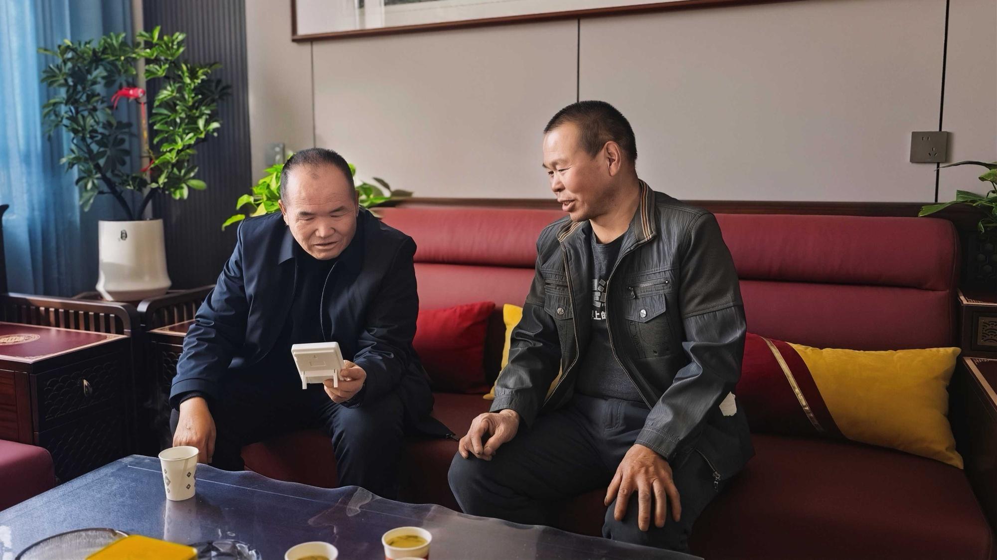 西峰區(qū)什社鄉(xiāng)避險搬遷群眾齊衛(wèi)忠與村民探討空氣能取暖設(shè)備用電情況(西峰區(qū)融媒體中心供圖)
