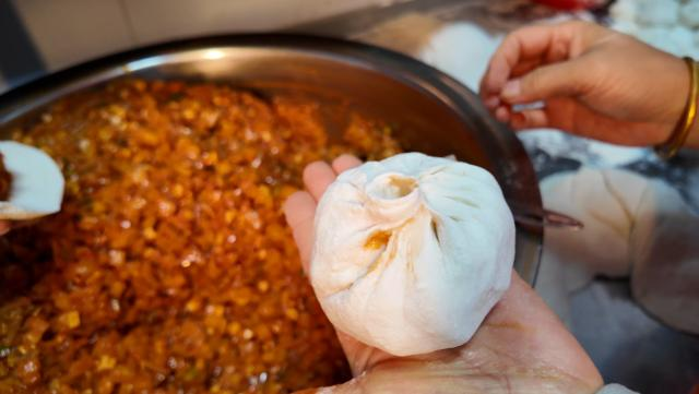 黃心洋芋去皮、切丁,配上軟嫩的豆腐、滑韌的粉條,再與蔥、姜、花椒面、辣椒面等香料一同調(diào)和。鹽與料要下得足、下得重,才能鎮(zhèn)得住黃土的風(fēng)味;一勺滾油潑上去,香氣“嗞啦”一聲騰起,餡料的魂便醒了。面團(tuán)搟成厚實(shí)的面皮,滿滿舀上一大勺土豆餡,仔細(xì)收口,包成圓鼓鼓的飽滿足形。上籠,猛火足汽蒸二十分鐘,炊煙般白蒙蒙的蒸汽里,面皮漸漸透出光潤,隱約能窺見內(nèi)里金黃糯潤的餡兒。