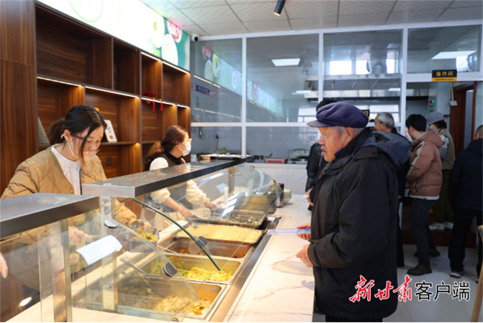 老人正在助餐中心排隊打飯。