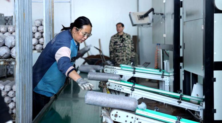 在華池縣閩輝農(nóng)業(yè)科技有限公司的菌棒生產(chǎn)車間內(nèi),機(jī)器轟鳴作響,工人們正有條不紊地進(jìn)行菌棒裝袋、分揀等作業(yè)。一條條自動(dòng)化生產(chǎn)線火力全開,源源不斷地產(chǎn)出標(biāo)準(zhǔn)化菌棒。