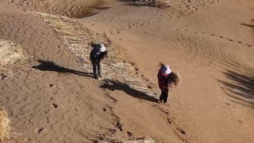 冬日,甘肅省阿克塞哈薩克族自治縣庫姆塔格沙漠邊緣迎來冬季治沙期。伴隨一場降雪過后,沙雪交融的茫茫戈壁中,一望無際的草方格覆蓋著高低起伏的沙丘,施工人員在沙漠中壓沙治沙,鋪設(shè)沙障,有序推進(jìn)祁連山北麓阿克塞片區(qū)水源涵養(yǎng)與生態(tài)保護(hù)修復(fù)項目。該項目是2025年阿克塞縣實施的“三北”重點工程,工程總規(guī)模22.2萬畝。