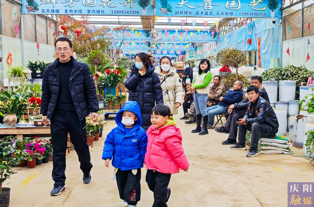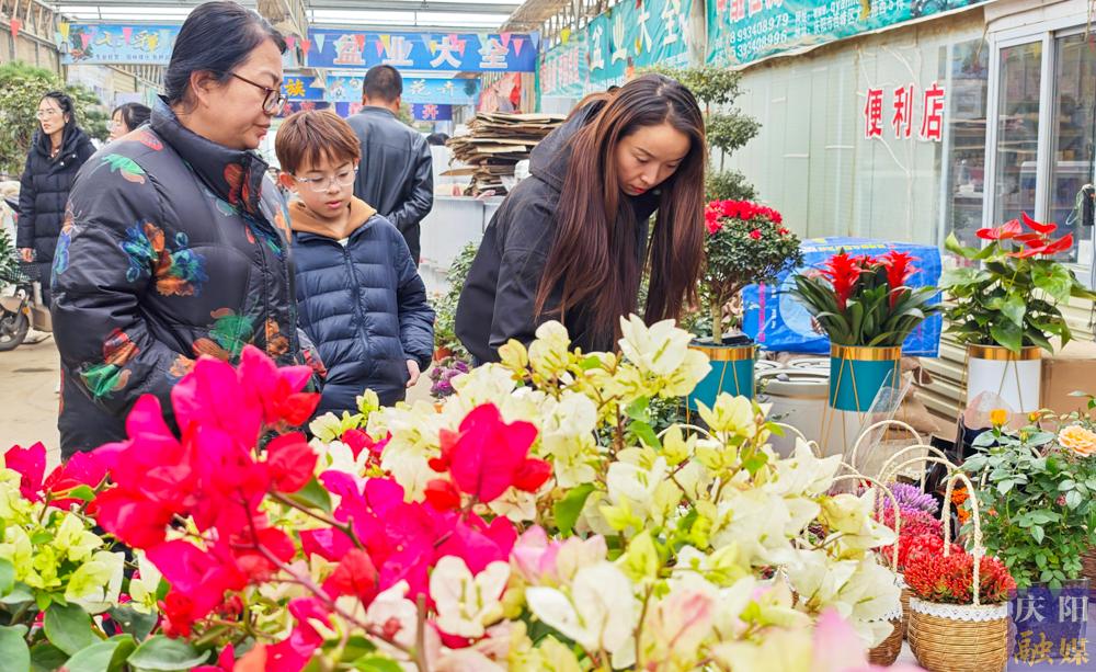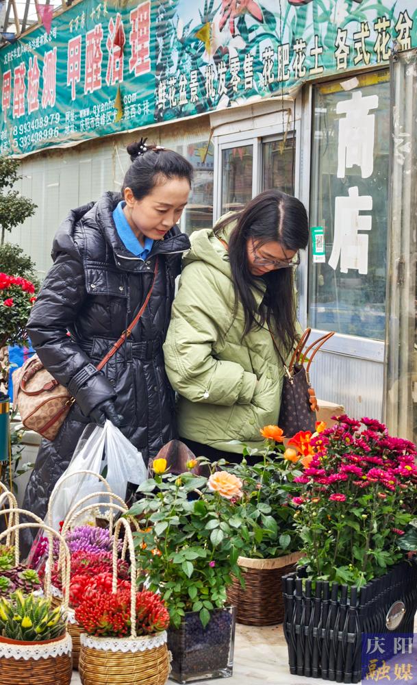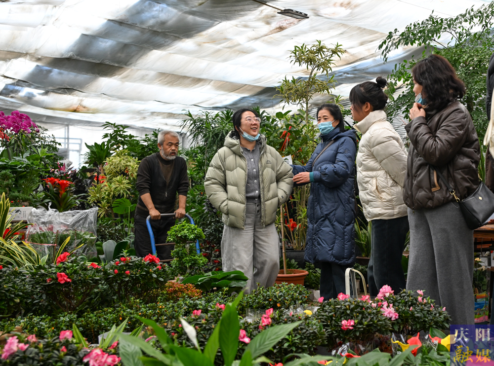市民在西峰區(qū)天富億花卉市場選購心儀盆栽。