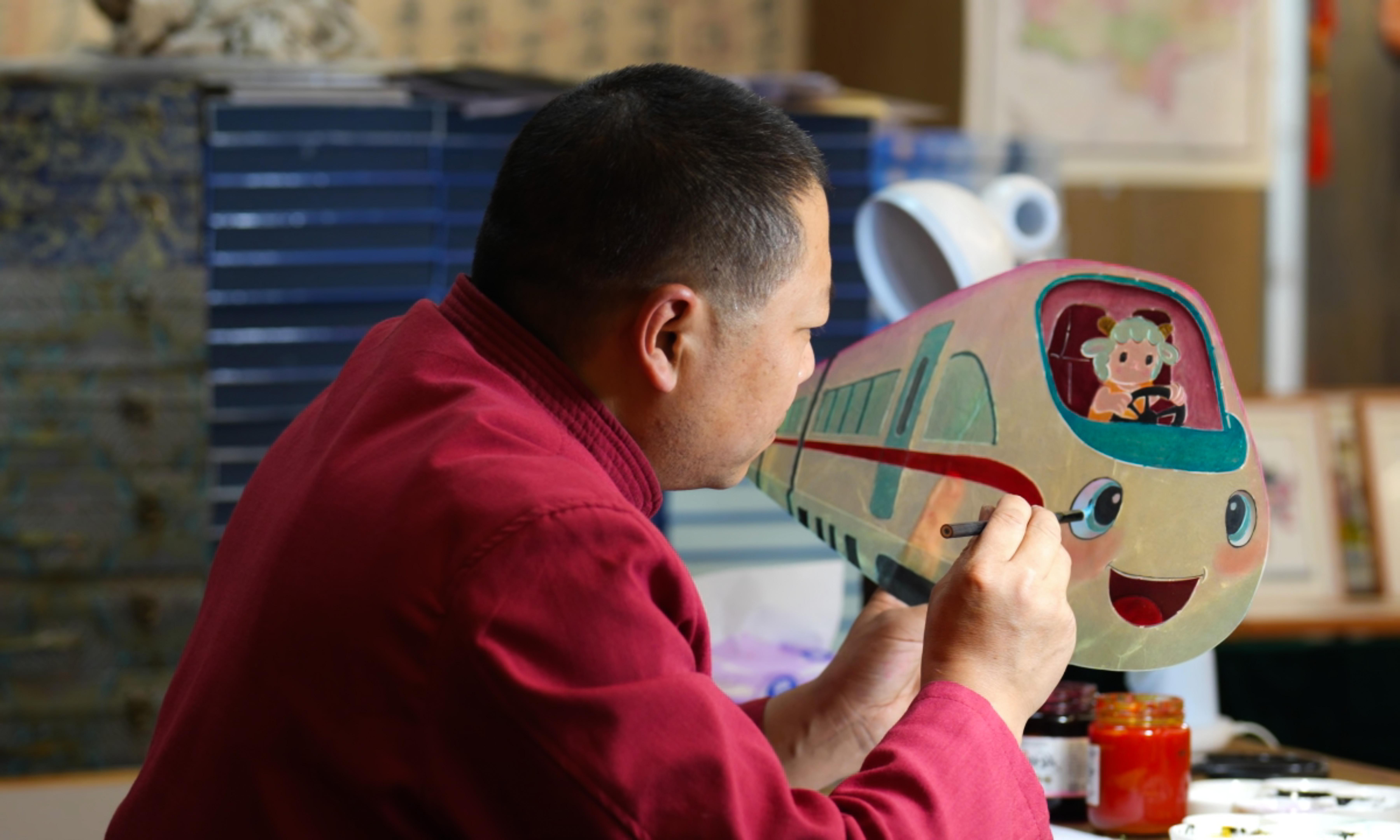 在環(huán)州故城皮影館,張治文老師正俯身專(zhuān)注雕琢著高鐵造型的皮影作品。他的指尖捏著細(xì)巧的刻刀,目光緊緊鎖在皮影的細(xì)節(jié)處,每一次落刀都沉穩(wěn)而精準(zhǔn),將高鐵的流線型輪廓、車(chē)窗里可愛(ài)的卡通形象都刻畫(huà)得栩栩如生。