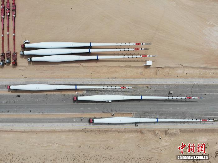 4月23日,航拍位于甘肅省武威市民勤縣的甘肅遠景能源有限公司運輸完成制造的智能風機葉片。李亞龍 攝
