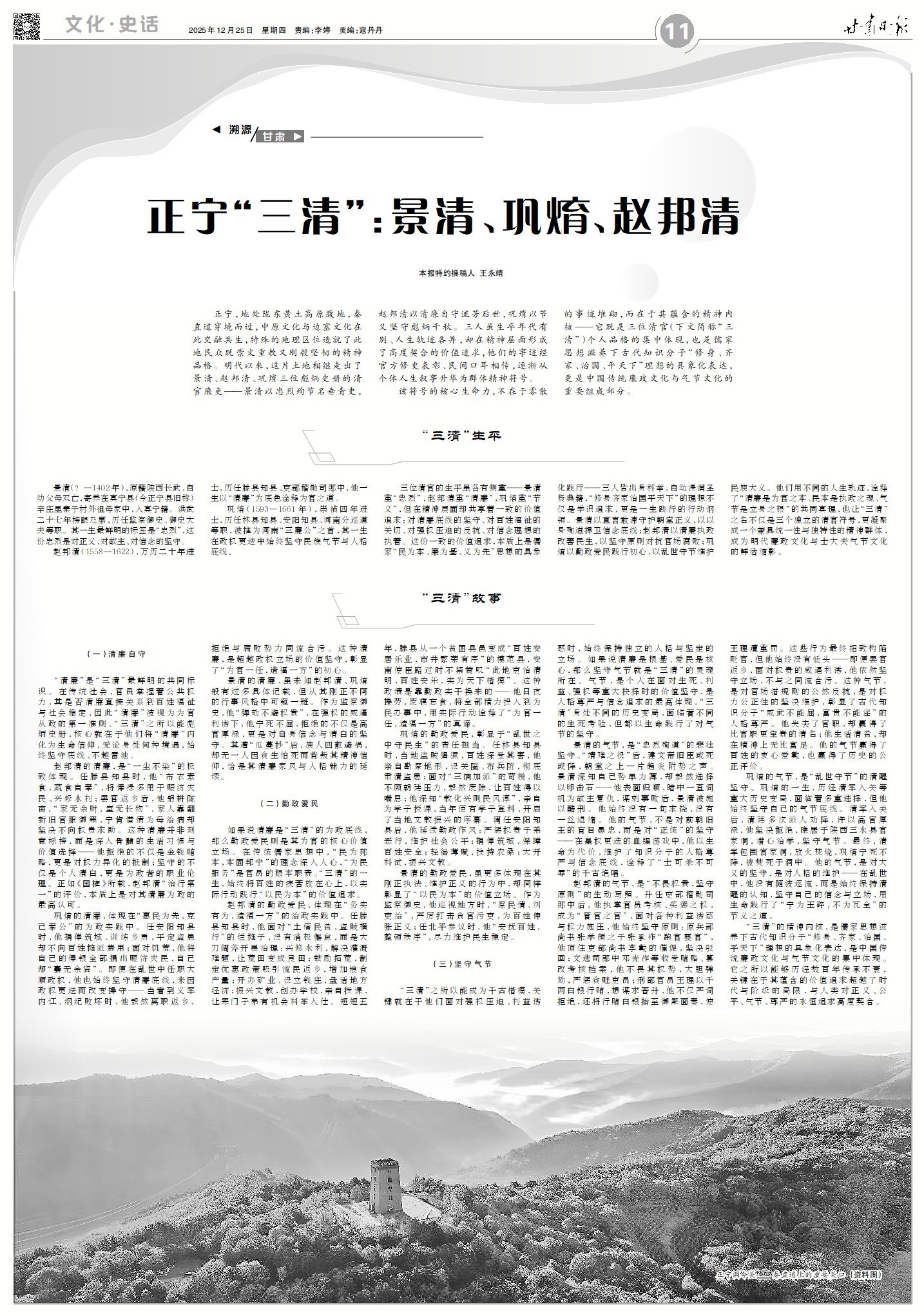 正寧,地處隴東黃土高原腹地,秦直道穿境而過,中原文化與邊塞文化在此交融共生,特殊的地理區(qū)位造就了此地民眾既崇文重教又剛毅堅(jiān)韌的精神品格。明代以來,這片土地相繼走出了景清、趙邦清、鞏焴三位彪炳史冊的清官廉吏——景清以忠烈殉節(jié)名垂青史,趙邦清以清廉自守流芳后世,鞏焴以節(jié)義堅(jiān)守彪炳千秋。三人雖生卒年代有別、人生軌跡各異,卻在精神層面形成了高度契合的價(jià)值追求,他們的事跡經(jīng)官方修史表彰、民間口耳相傳,逐漸從個(gè)體人生敘事升華為群體精神符號。