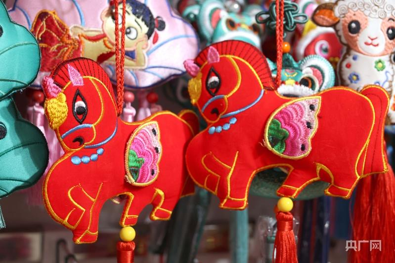 “這款是剛做好的‘壽馬迎春’香包擺件,造型很飽滿,全身紅彤彤的,看著就喜慶富態(tài)!馬身上還繡了菊花紋樣,菊花代表長壽安康,搭配這吉祥的紅馬,傳遞出富貴長壽、迎春納福的美好寓意……”趙麗珺邊展示各種款式的香包,邊告訴記者,每年端午、春節(jié)是香包銷售旺季,最近馬元素香包、十二生肖掛件等比較受歡迎。