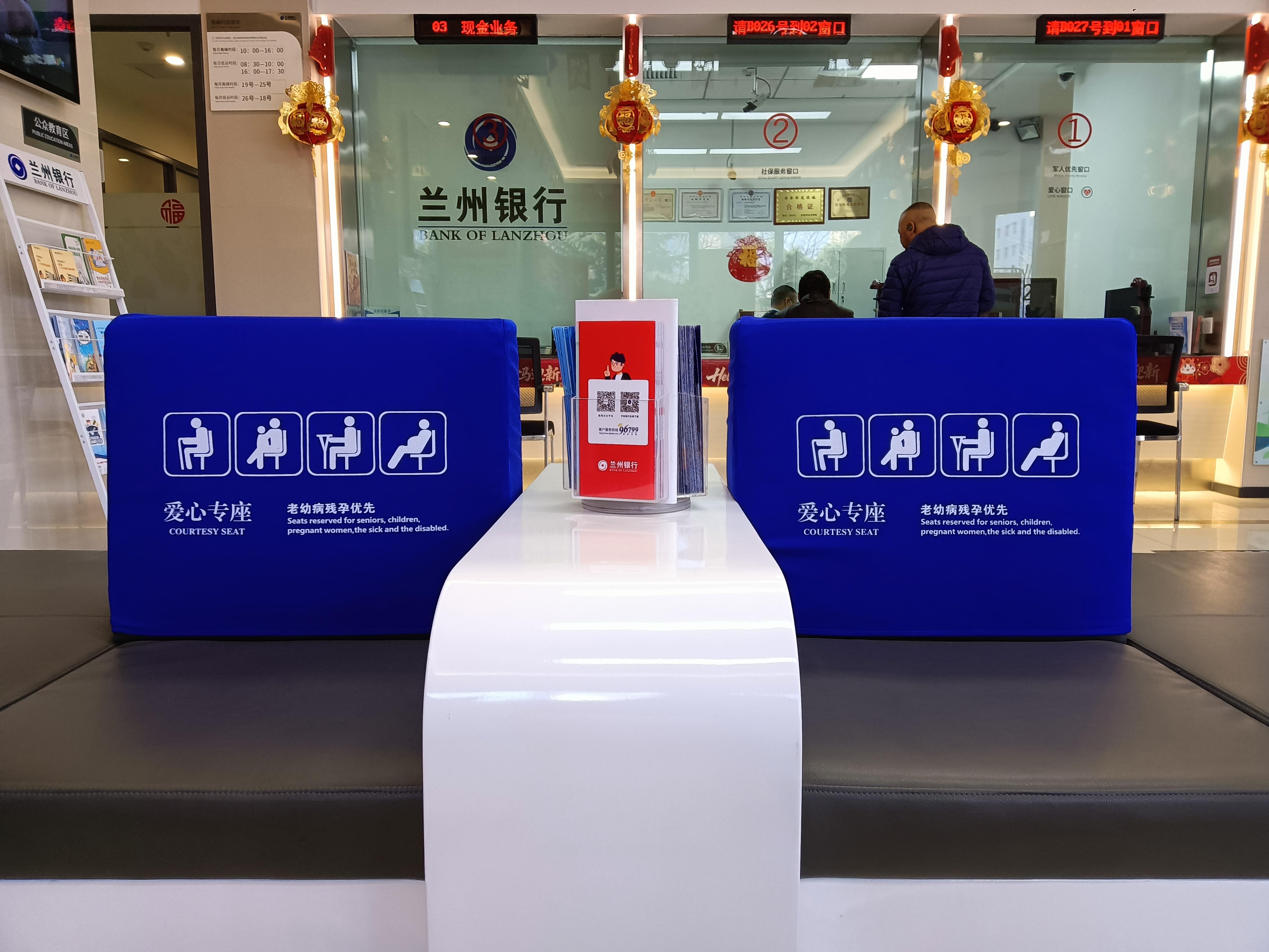 蘭州銀行營業(yè)網(wǎng)點設(shè)立愛心專坐,擺放反詐宣傳資料。
