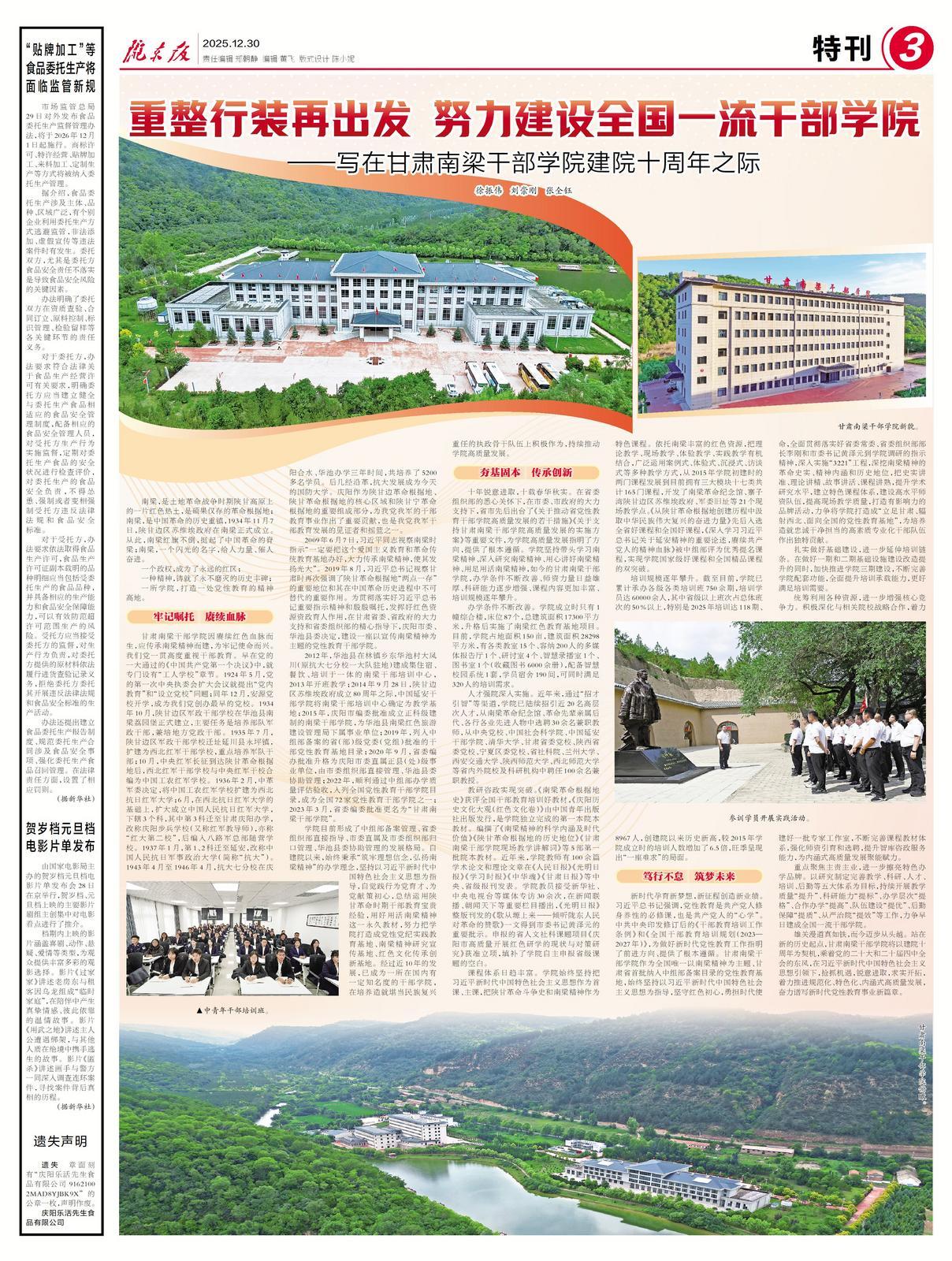 甘肅南梁干部學(xué)院因賡續(xù)紅色血脈而生,應(yīng)傳承南梁精神而建,為牢記使命而興。我們黨一貫高度重視干部教育。早在黨的一大通過的《中國共產(chǎn)黨第一個決議》中,就專門設(shè)有“工人學(xué)?!闭鹿?jié)。1924年5月,黨的第一次中央執(zhí)委會擴(kuò)大會議就提出“黨內(nèi)教育”和“設(shè)立黨?!眴栴};同年12月,安源黨校開學(xué),成為我們黨創(chuàng)辦最早的黨校。1934年10月,陜甘邊區(qū)軍政干部學(xué)校在華池縣南梁荔園堡正式建立,主要任務(wù)是培養(yǎng)部隊軍政干部,兼培地方黨政干部。1935年7月,陜甘邊區(qū)軍政干部學(xué)校遷址延川縣永坪鎮(zhèn),擴(kuò)建為西北紅軍干部學(xué)校,重點培養(yǎng)軍隊干部;10月,中央紅軍長征到達(dá)陜甘革命根據(jù)地后,西北紅軍干部學(xué)校與中央紅軍干校合編為中國工農(nóng)紅軍學(xué)校。1936年2月,中革軍委決定,將中國工農(nóng)紅軍學(xué)校擴(kuò)建為西北抗日紅軍大學(xué);6月,在西北抗日紅軍大學(xué)的基礎(chǔ)上,擴(kuò)大成立中國人民抗日紅軍大學(xué),下轄3個科,其中第3科遷至甘肅慶陽辦學(xué),改稱慶陽步兵學(xué)校(又稱紅軍教導(dǎo)師),亦稱“紅大第二?!?,后編入八路軍總部隨營學(xué)校。1937年1月,第1、2科遷至延安,改稱中國人民抗日軍事政治大學(xué)(簡稱“抗大”)。1943年4月至1946年4月,抗大七分校在慶陽合水、華池辦學(xué)三年時間,共培養(yǎng)了5200多名學(xué)員。后幾經(jīng)沿革,抗大發(fā)展成為今天的國防大學(xué)。慶陽作為陜甘邊革命根據(jù)地、陜甘革命根據(jù)地的核心區(qū)域和陜甘寧革命根據(jù)地的重要組成部分,為我黨我軍的干部教育事業(yè)作出了重要貢獻(xiàn),也是我黨我軍干部教育發(fā)展的見證者和搖籃之一。