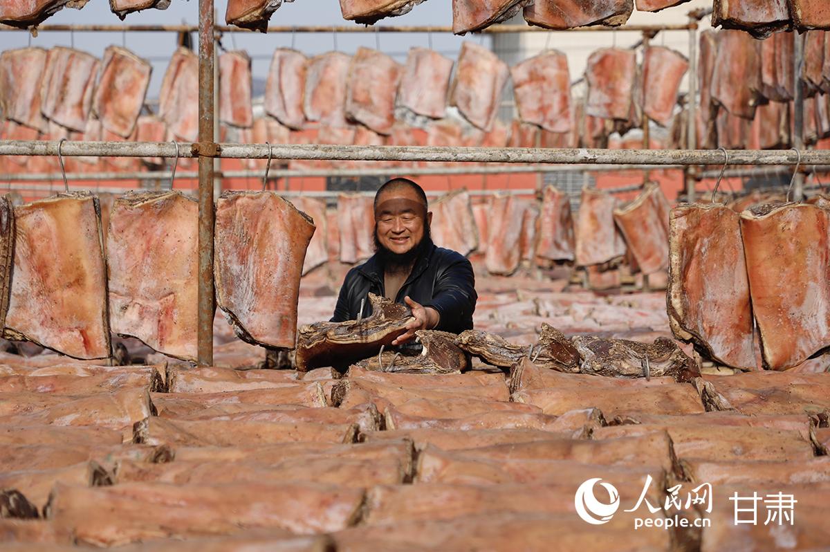 色澤紅潤(rùn)、油脂晶瑩的隴西臘肉是當(dāng)?shù)卮硇缘膫鹘y(tǒng)美味。人民網(wǎng)記者 焦隆攝