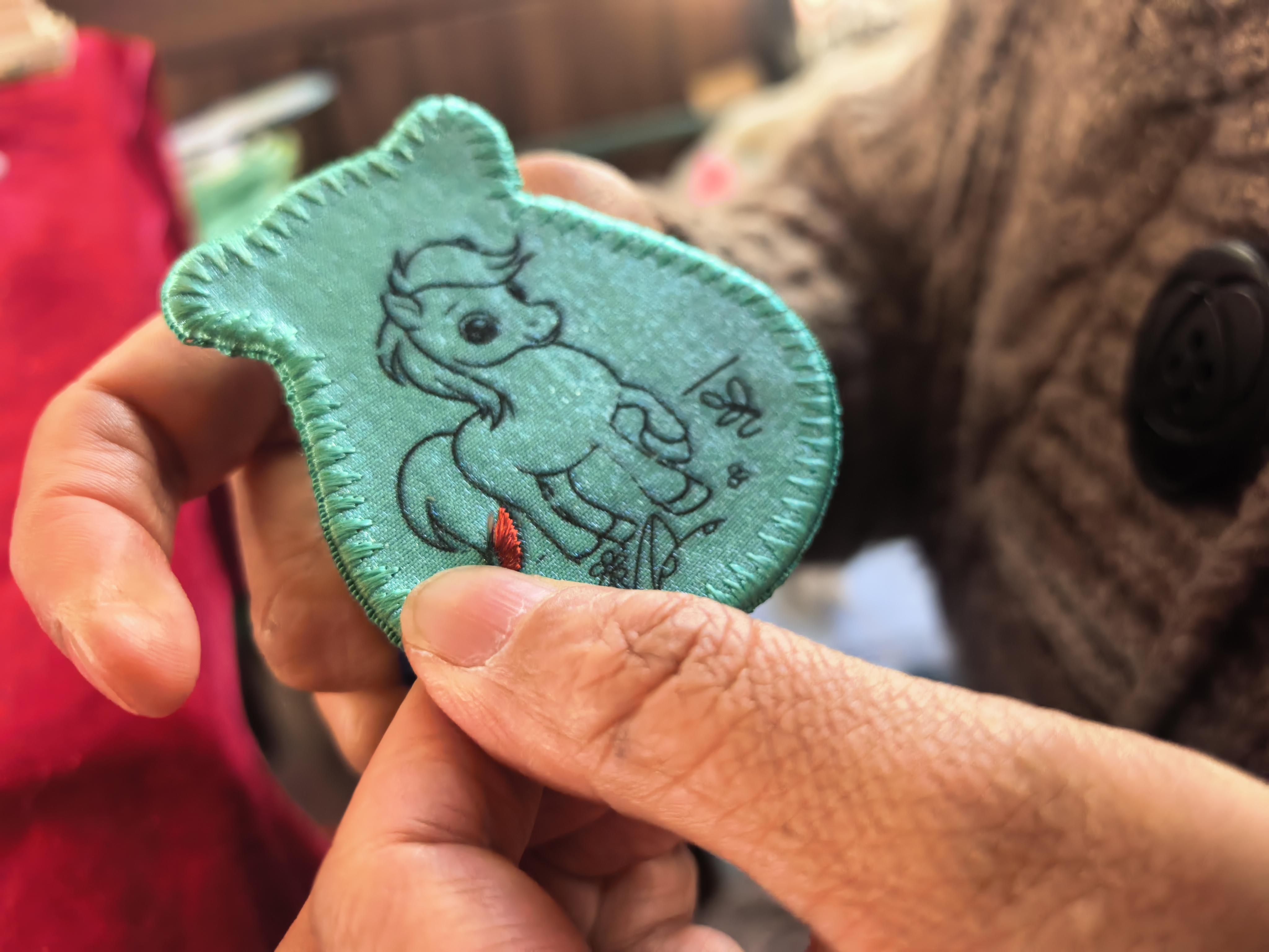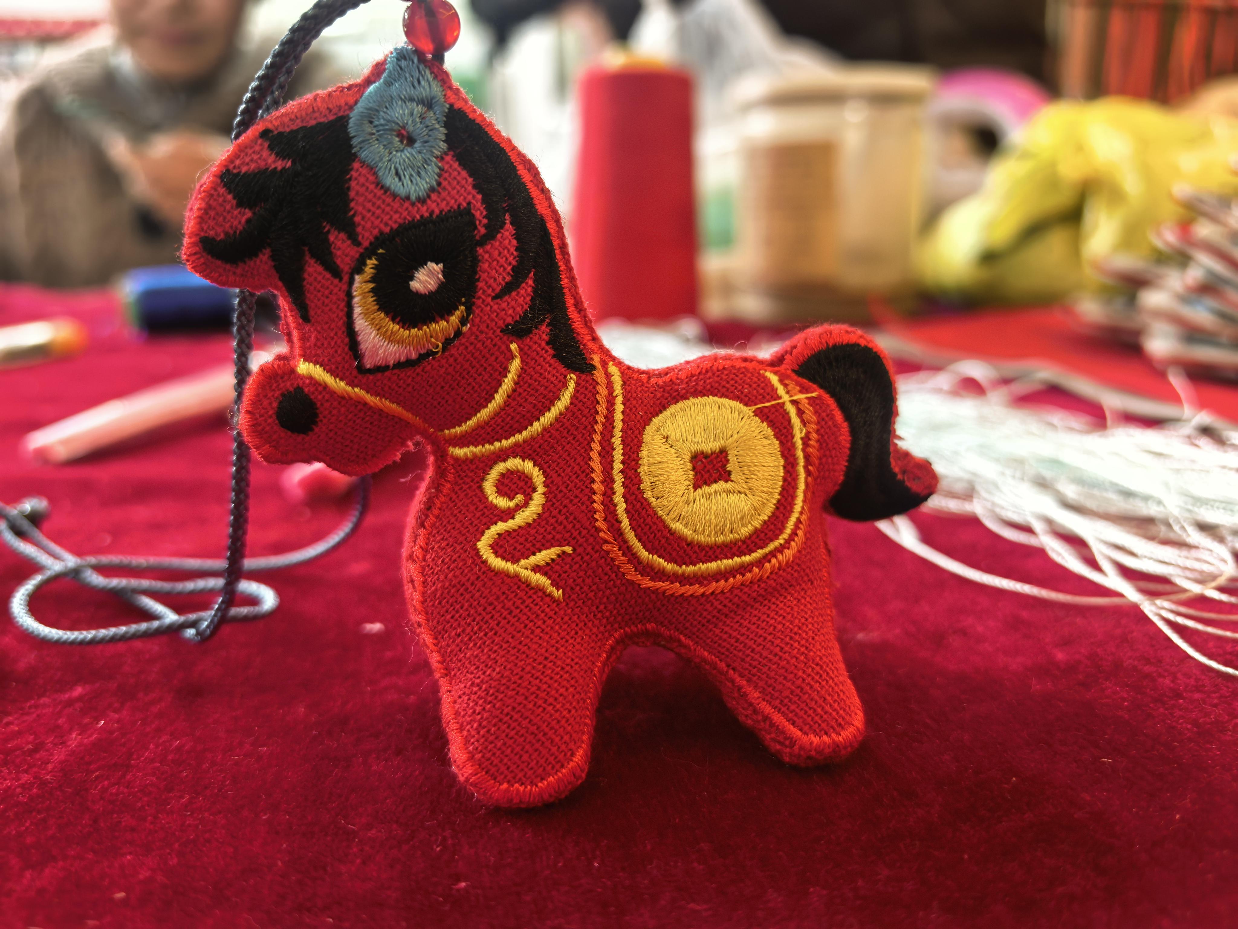 “每個針腳都要均勻,每個轉(zhuǎn)折都要自然。”曹偉偉專注地調(diào)整著絲線的角度,讓甲骨文的古樸與刺繡的精致完美融合。她的工作臺上,各式各樣的馬元素作品琳瑯滿目:有鞋墊上的吉祥馬,有掛件上的卡通馬,每一件都承載著美好的寓意。