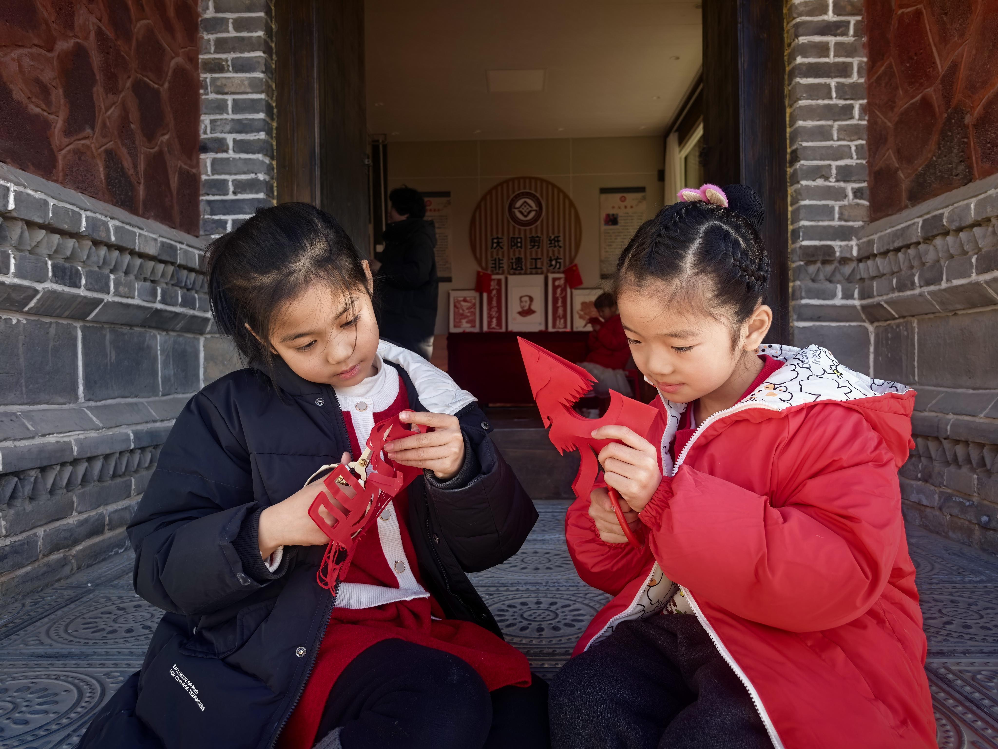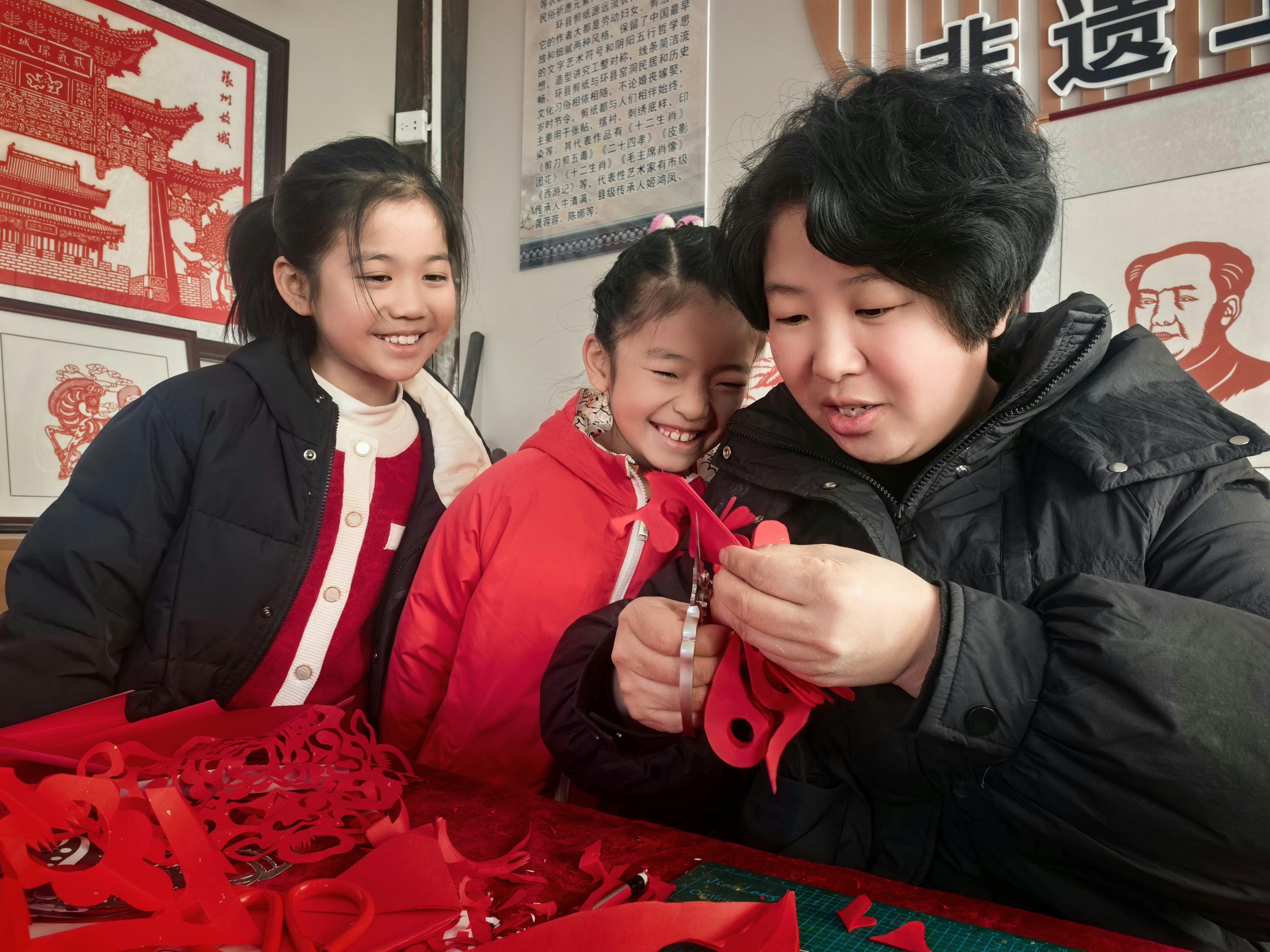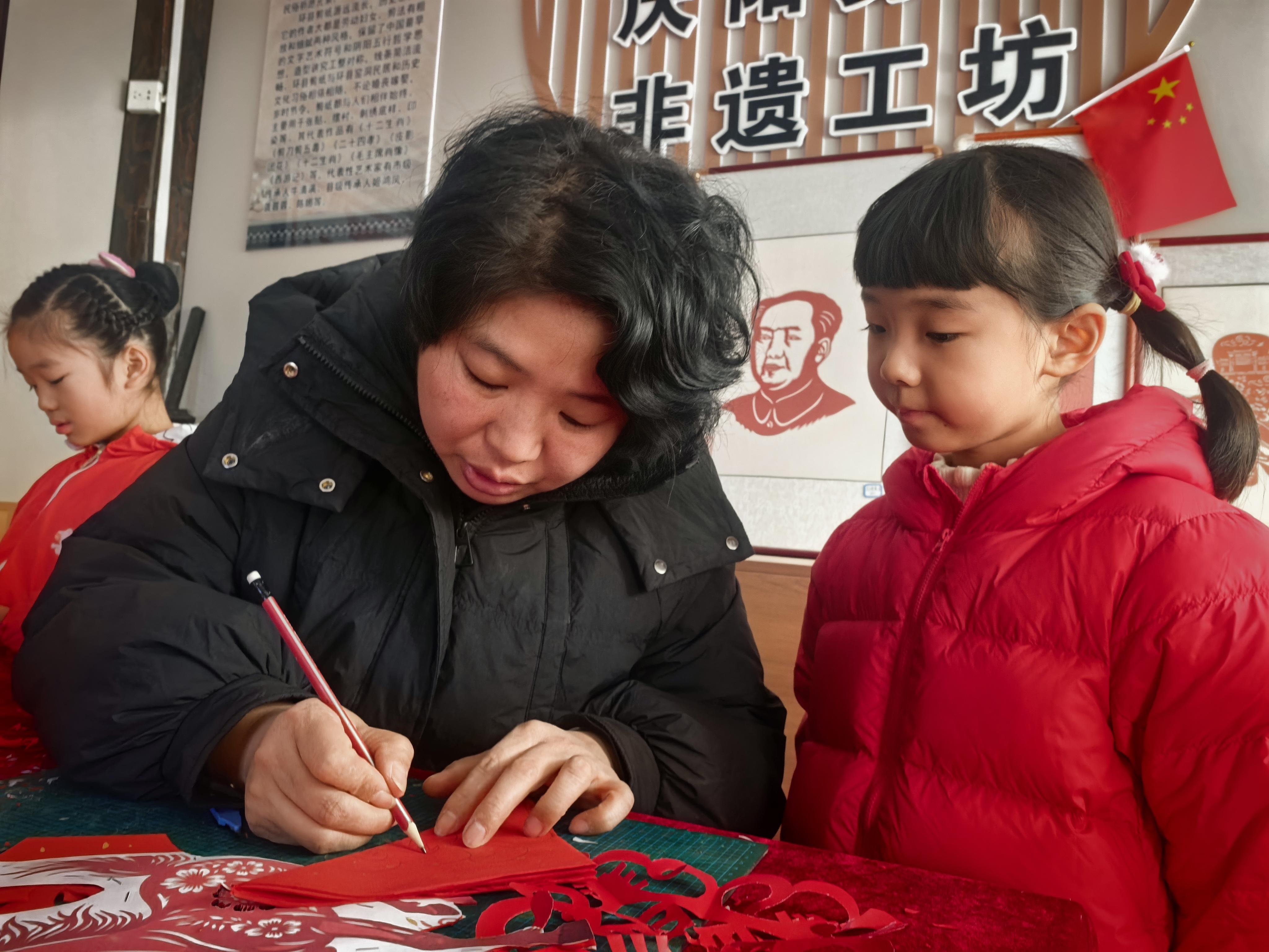 數(shù)九寒天,黃土高原上的環(huán)州故城被嚴(yán)寒包裹。然而,走進(jìn)故城一隅的非遺剪紙工坊,卻是另一番景象:談笑風(fēng)生,暖意融融,紙屑如紅雪般紛揚(yáng)。非遺傳承人李晶晶俯身在一群孩童之間,手中銀剪流轉(zhuǎn),指尖輕攏慢捻,一匹栩栩如生、鬃毛飛揚(yáng)的“小飛馬”便在她手中誕生。孩子們澄澈的眼眸里,映著窗花鮮紅的色彩,也映著一段跨越時(shí)空的文化接力。