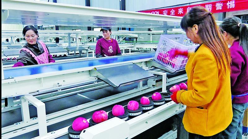 桐川鎮(zhèn)家榮果蔬冷藏庫的分揀車間里,工人將蘋果分級儲存。慶陽融媒記者 葛亞妮 攝