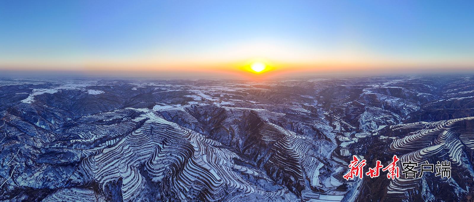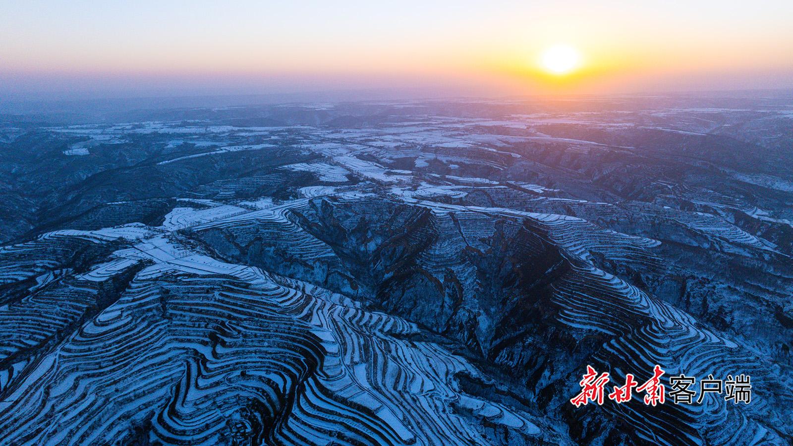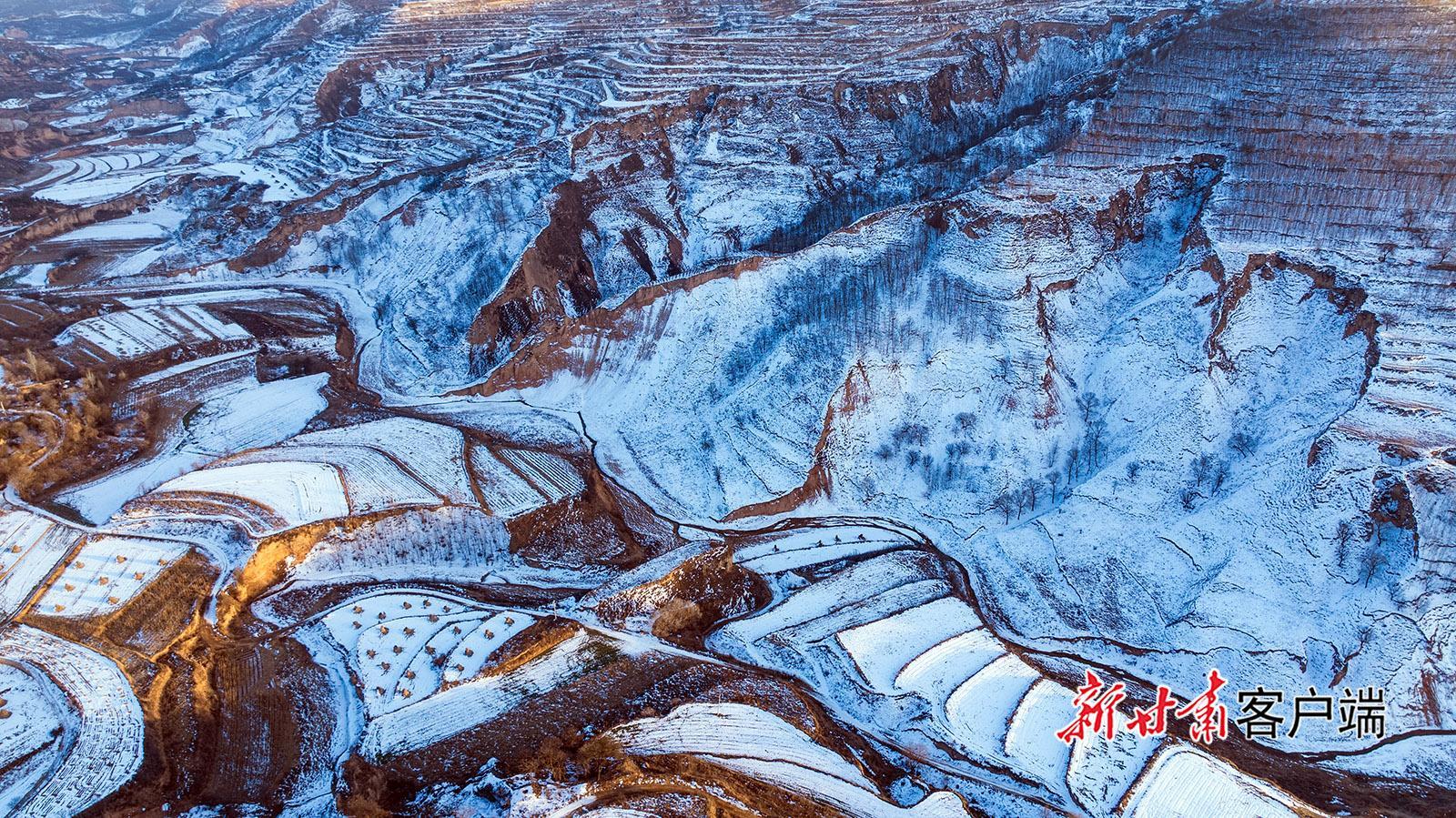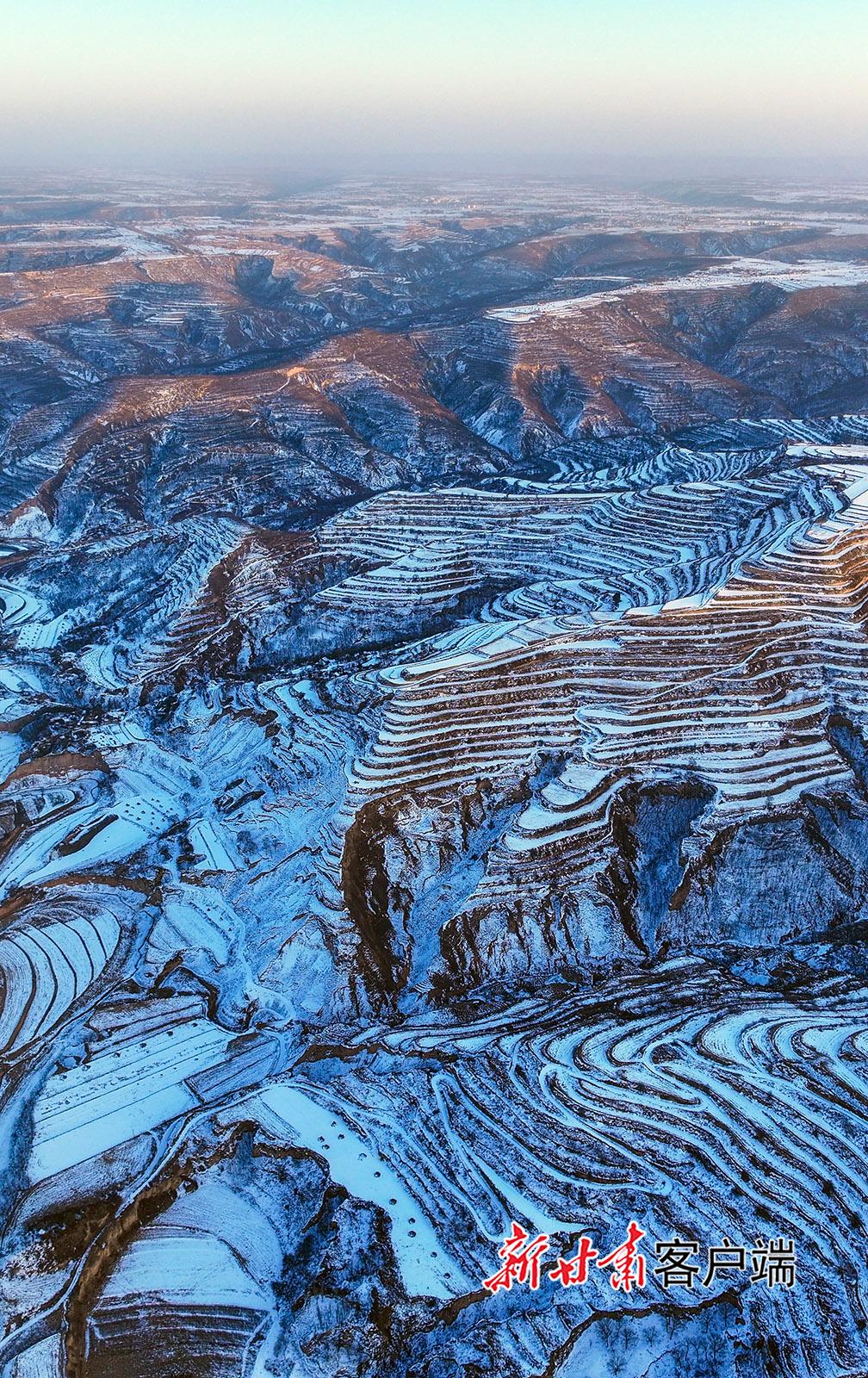 1月10日,俯瞰雪后的鎮(zhèn)原縣南川鄉(xiāng),梯田在白雪覆蓋下,如同巨大的白色階梯,仿佛是大自然用細(xì)膩的筆觸勾勒出的壯美畫卷。