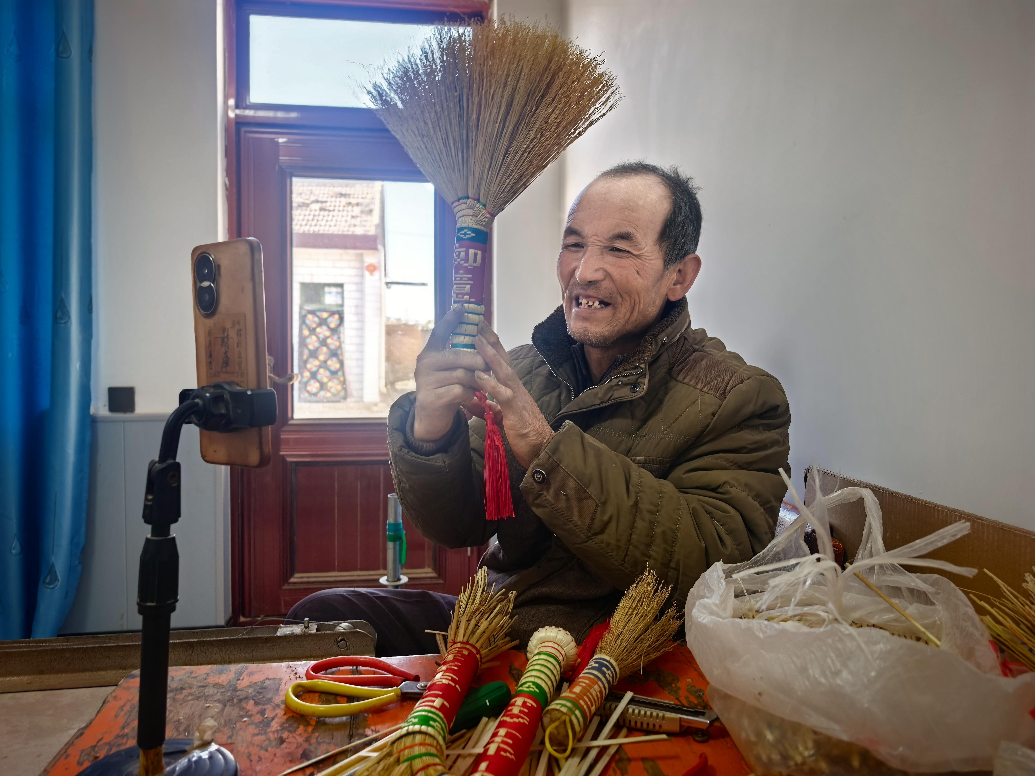 一月中旬,甘肅省環(huán)縣羅山川鄉(xiāng),寒風(fēng)掠過(guò)黃土高原的溝壑。大樹(shù)塬村北塬頭組的一間新房里,59歲的李相玉正埋頭綁扎一把五彩高粱笤帚。彩線在他指尖穿梭,漸漸在笤帚把上呈現(xiàn)出“馬年大吉”四個(gè)秀氣的字樣。房間里,上百把笤帚整齊排列——小巧玲瓏的保健捶、造型別致的癢癢撓、綴著“?!弊值膲臁⒕聦?shí)用的按摩棒……這些早已被預(yù)訂一空的手工藝品,即將發(fā)往北京、上海、廣州等二十多個(gè)城市。