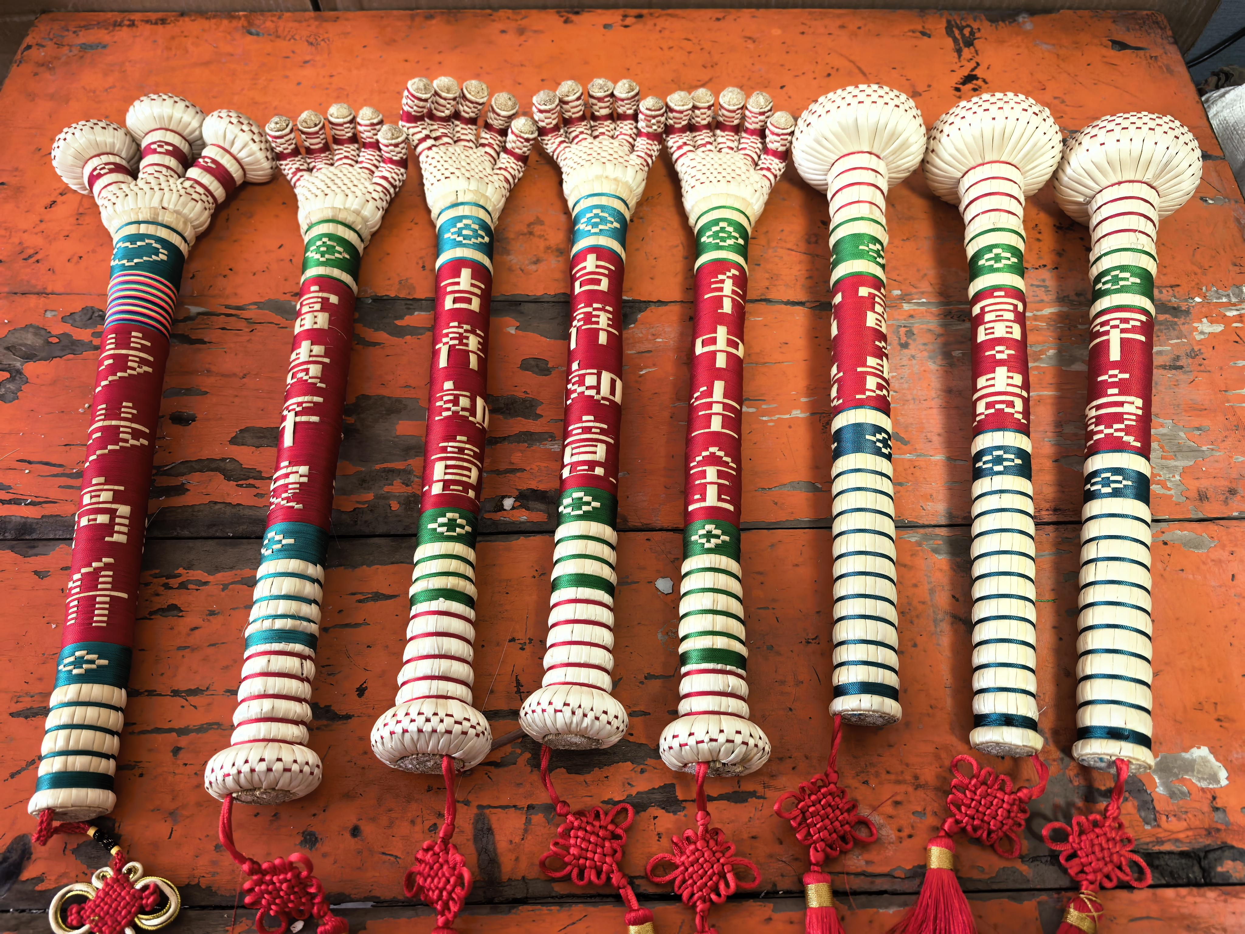 回到環(huán)縣后,李相玉開(kāi)始了他的“笤帚革命”。他不再滿足于傳統(tǒng)的實(shí)用笤帚,而是嘗試將民俗文化元素融入創(chuàng)作:用彩線在把手上編織“?!薄皣帧薄凹钡燃樽謽樱婚_(kāi)發(fā)出保健捶、癢癢撓、按摩棒等健康養(yǎng)生產(chǎn)品。