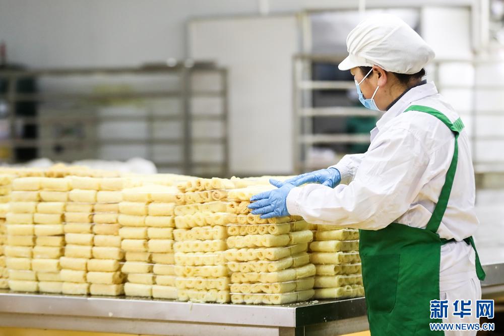 1月15日,在甘肅省隴南市徽縣的甘肅兆豐農(nóng)業(yè)開(kāi)發(fā)有限責(zé)任公司生產(chǎn)車間內(nèi),工作人員將生產(chǎn)的豆鈴卷碼放整齊。新華社記者 郎兵兵 攝