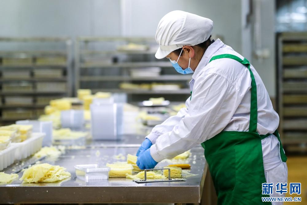 1月15日,在甘肅省隴南市徽縣的甘肅兆豐農(nóng)業(yè)開(kāi)發(fā)有限責(zé)任公司生產(chǎn)車間,工作人員包裝油炸豆皮。新華社記者 郎兵兵 攝