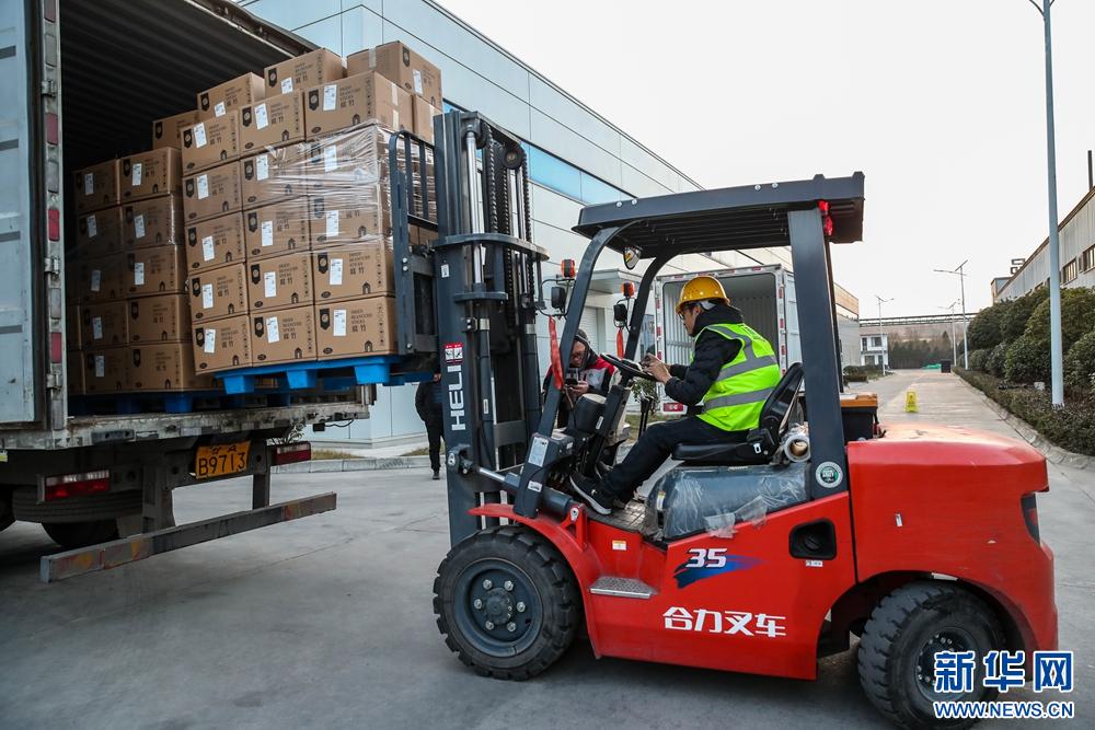 1月15日,在甘肅省隴南市徽縣的甘肅兆豐農(nóng)業(yè)開(kāi)發(fā)有限責(zé)任公司,叉車工人將出口沙特阿拉伯的一批豆制品轉(zhuǎn)運(yùn)裝車。新華社記者 郎兵兵 攝