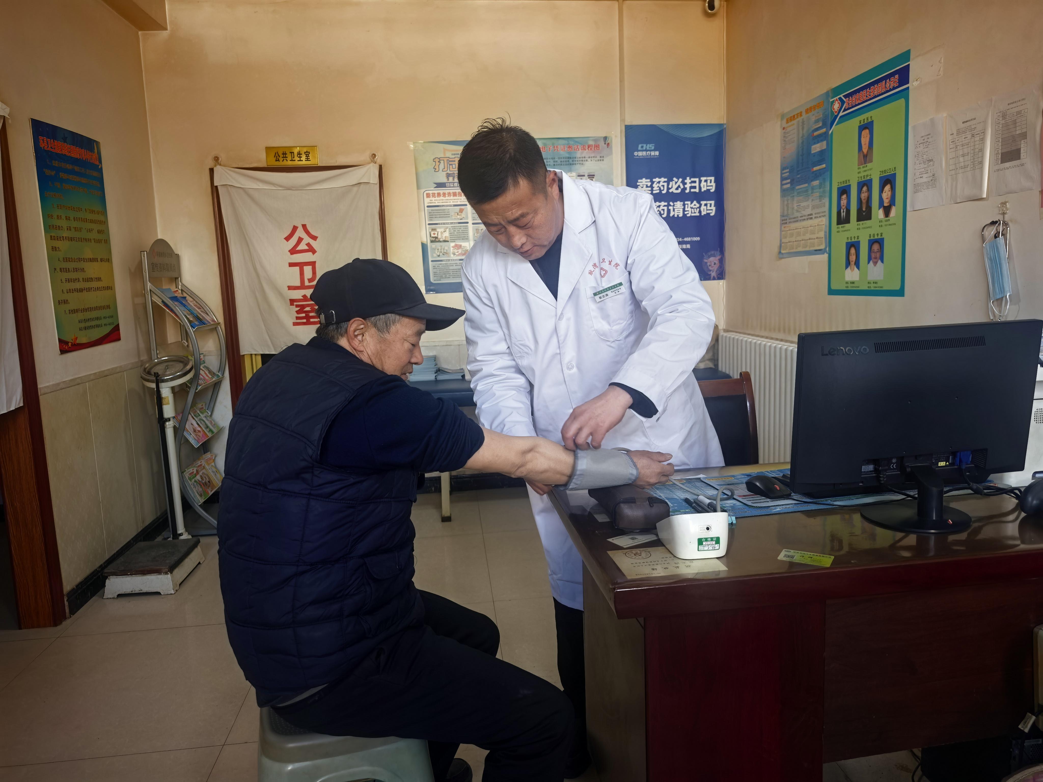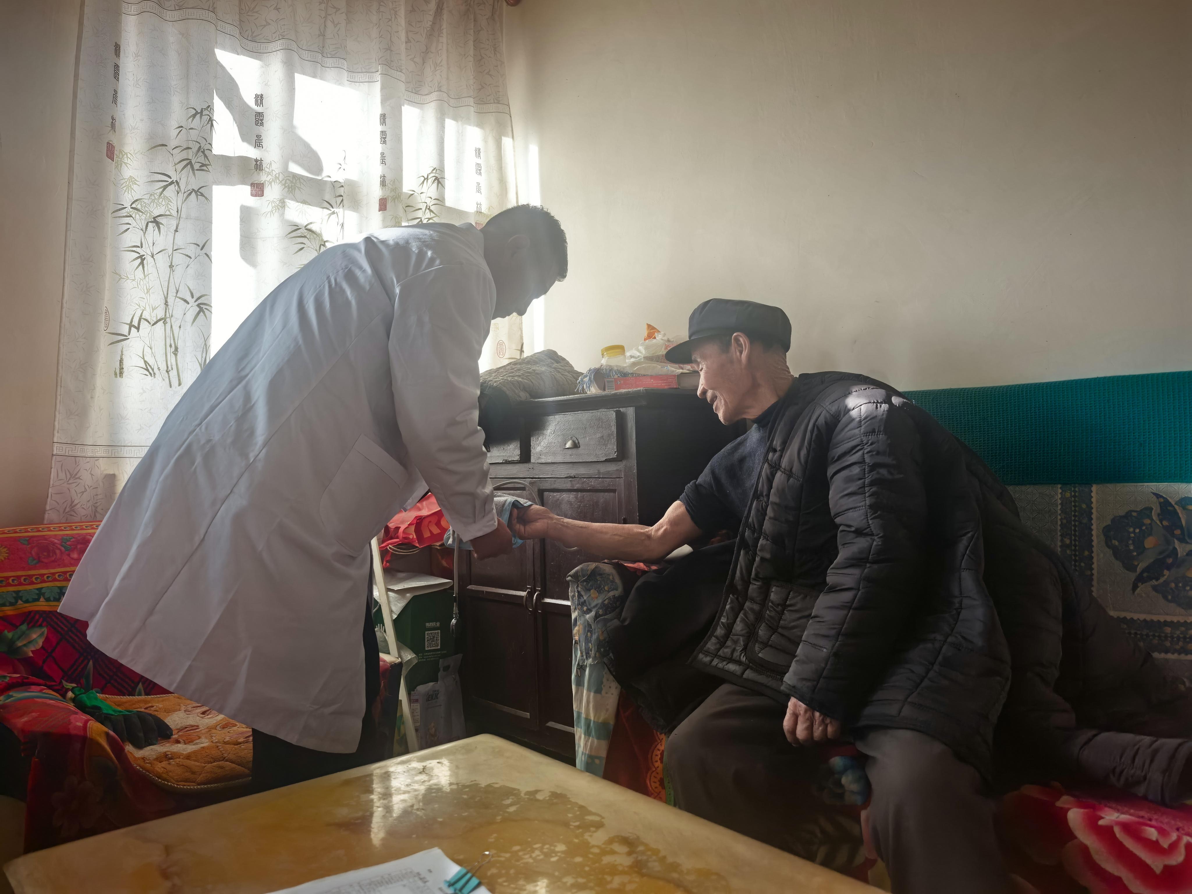走進(jìn)梁占榮老人的家,更能體會(huì)這份守護(hù)的具體模樣。86歲的梁占榮和79歲的妻子繆蘭花,相濡以沫,守著老屋。崔志濤上門時(shí),屋里便熱鬧起來(lái)。他一邊熟練地為老兩口測(cè)量血壓,用聽診器仔細(xì)聽著心跳,一邊像拉家常般詢問(wèn)最近的飲食睡眠。檢查完畢,他拿出老人的藥,一遍遍耐心講解用法用量?!笆?,嬸,豬肉要少吃,酒和煙咱們可得戒了。炒菜啊,油和鹽都得再減減……”這些叮囑,他不知重復(fù)了多少遍,每一次卻依然如同第一次般認(rèn)真、懇切。老人聽得頻頻點(diǎn)頭,渾濁的眼眸里映照著這位“鄉(xiāng)村健康管家”可靠的身影。這樣的場(chǎng)景,在張臺(tái)村的許多院落里,靜默而規(guī)律地上演著。