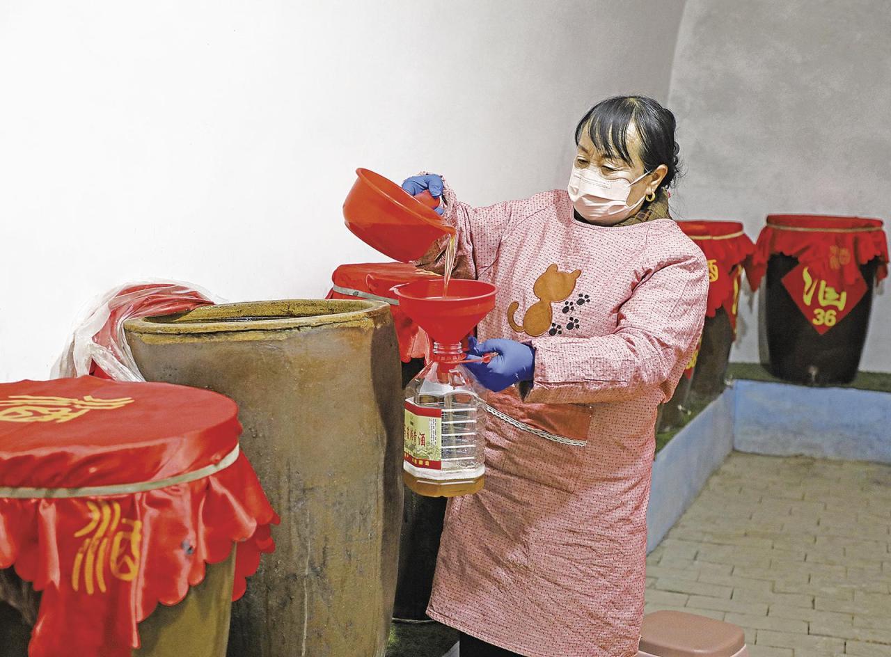 同村55歲的張貴珍,也是村里小有名氣的釀酒大戶。入冬以來,他家新釀造的近70缸黃酒供不應求,記者到訪時,他正組織村民在院子里忙著包裝、張貼標簽?!耙郧胺N地靠天吃飯,現(xiàn)在有了釀酒這個致富產(chǎn)業(yè),日子越來越有奔頭,今年我打算把產(chǎn)量提高到100缸?!睆堎F珍說。