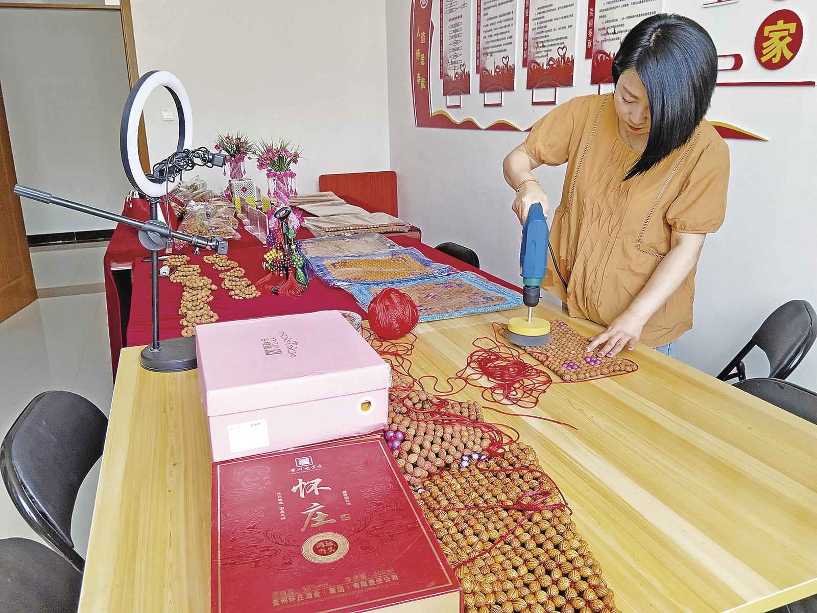 華池縣北關(guān)社區(qū)居民在制作山核桃枕頭。