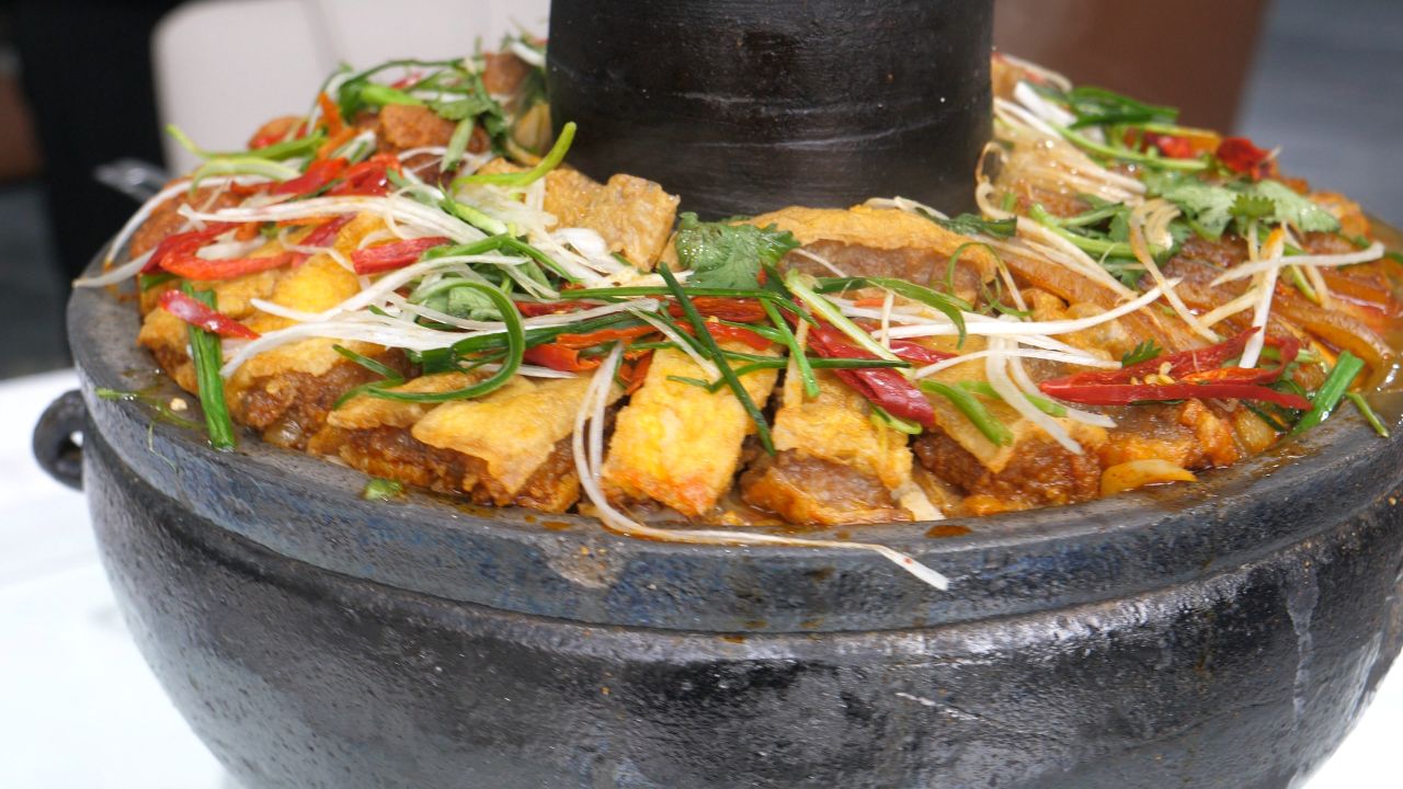 暖鍋不是鍋,是寧縣冬日的“圓心”。一尊敦實(shí)的黃銅鍋?zhàn)樱虚g聳著煙囪,底下藏著炭火,周圍一圈“?!崩?,乾坤朗朗。最底層,是吸飽了湯汁的淡黃花白,瑩潤如宣紙;其上,層層碼著鹵過的豬五花,片得飛薄,透光時(shí)能看到風(fēng)霜的紋路;再是手打的肉丸、嫩黃的豆腐、墨綠的山野蕨菜……秩序井然,宛如一座微縮的城池。