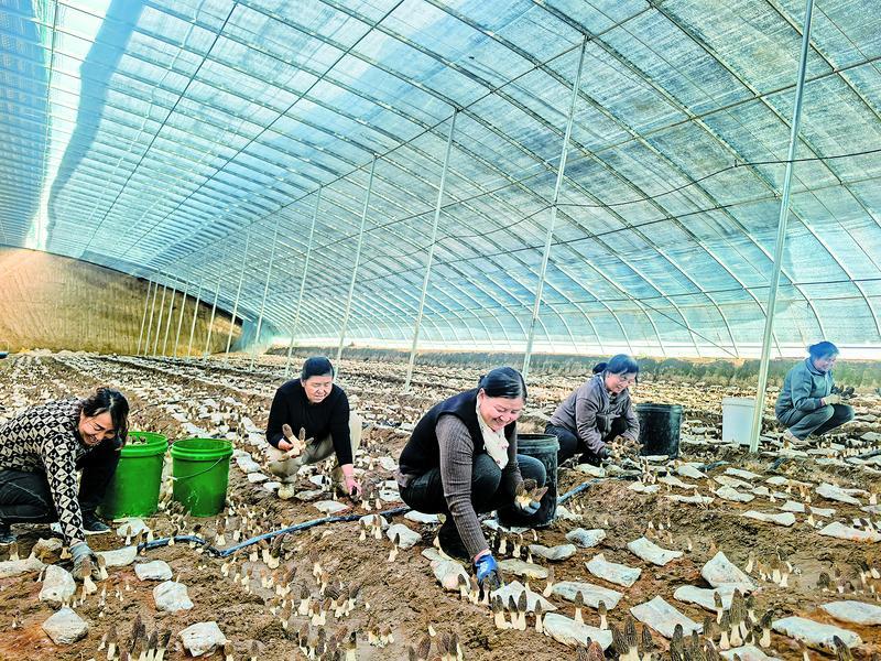 平泉鎮(zhèn)馬洼村群眾正在食用菌基地采摘羊肚菌
