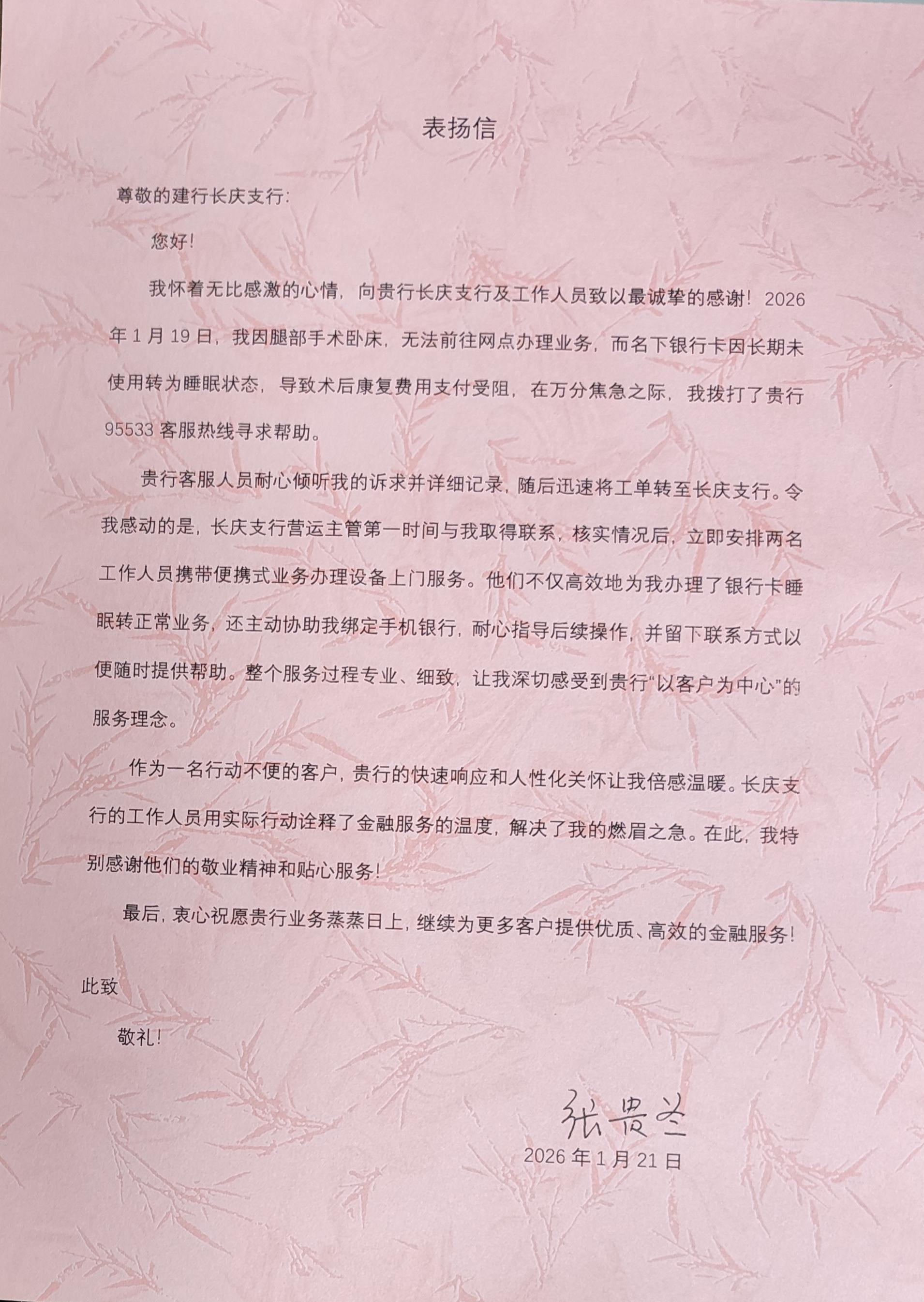 “本來以為要等很久,沒想到銀行這么快就上門解決了問題,真的太感謝了!”業(yè)務(wù)辦結(jié)后,張某對長慶支行工作人員的專業(yè)、高效和充滿人情味的服務(wù)給予了高度評價。