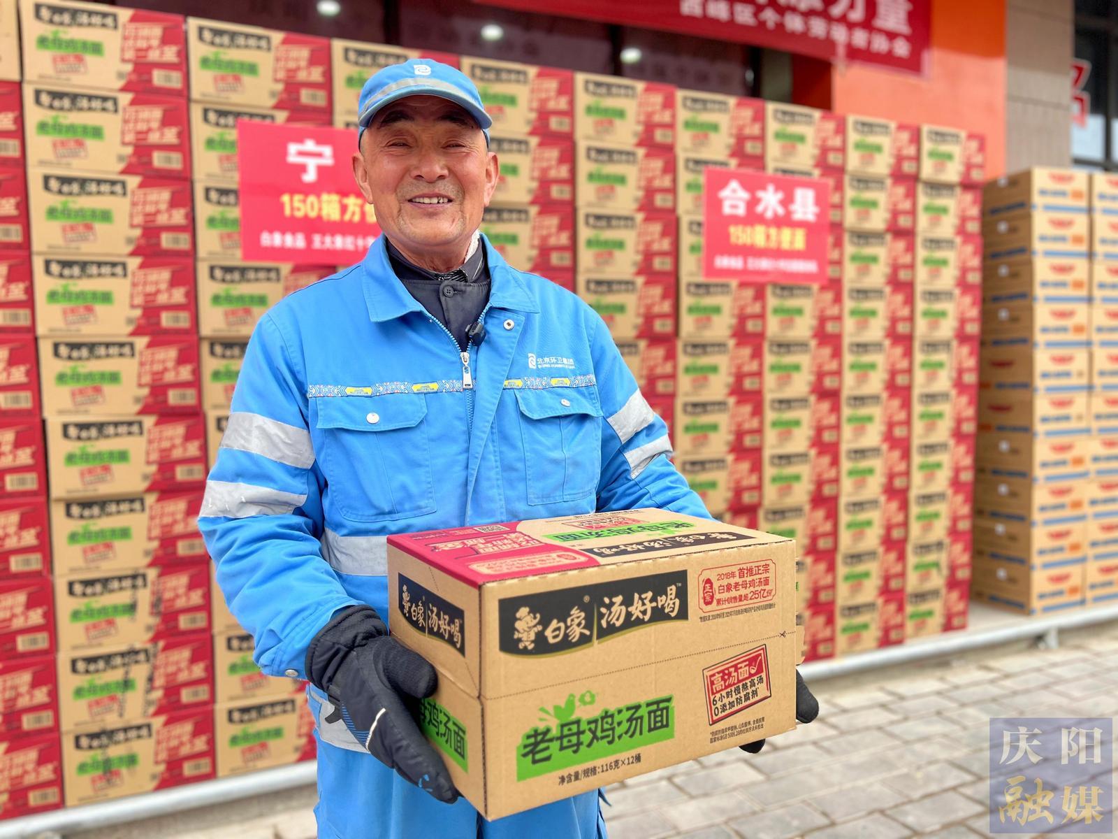物資發(fā)放環(huán)節(jié),溫情瞬間不斷上演。王杰理親自上手,將一箱箱愛心方便面送到環(huán)衛(wèi)工人手中,一句句關(guān)切的問候、一個(gè)個(gè)溫暖的舉動(dòng),讓在場(chǎng)的每一位受助者都倍感暖心。接過沉甸甸的方便面,環(huán)衛(wèi)工人們淳樸的臉上綻放出真摯的笑容,言語間滿是感激?!捌綍r(shí)我就常去慶陽炒面吃飯,咱們環(huán)衛(wèi)工能享五折優(yōu)惠,十塊錢的面五塊錢就能吃上,實(shí)惠又暖心。今天又領(lǐng)到這么一箱方便面,真是太感謝這些愛心人士和企業(yè)了!”環(huán)衛(wèi)工孫永生捧著方便面,笑得合不攏嘴,樸實(shí)的話語里滿是感動(dòng)。